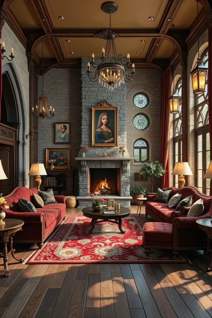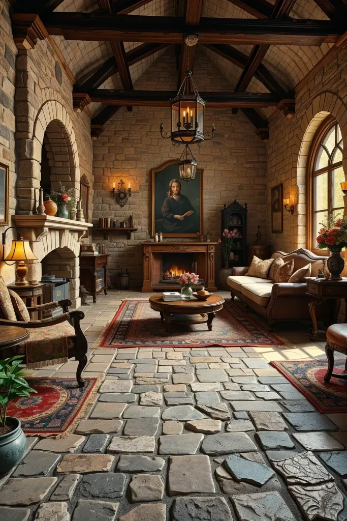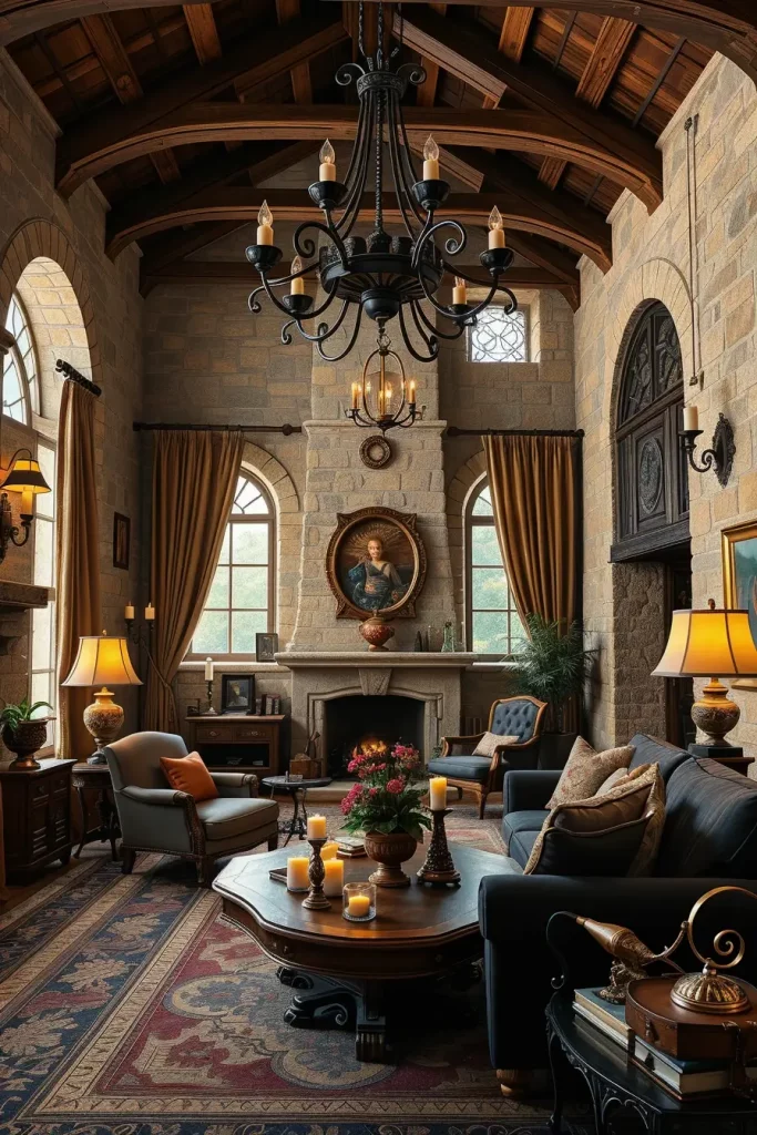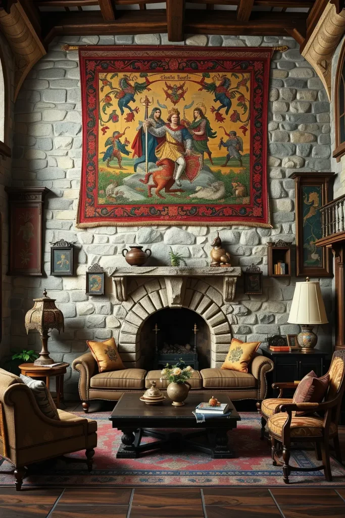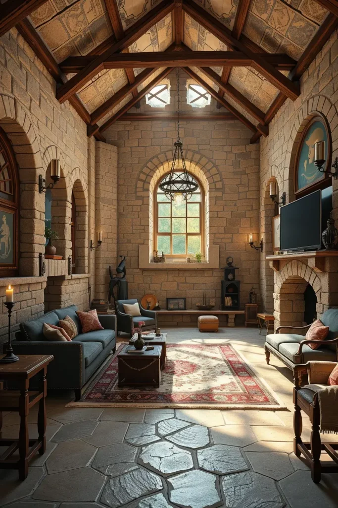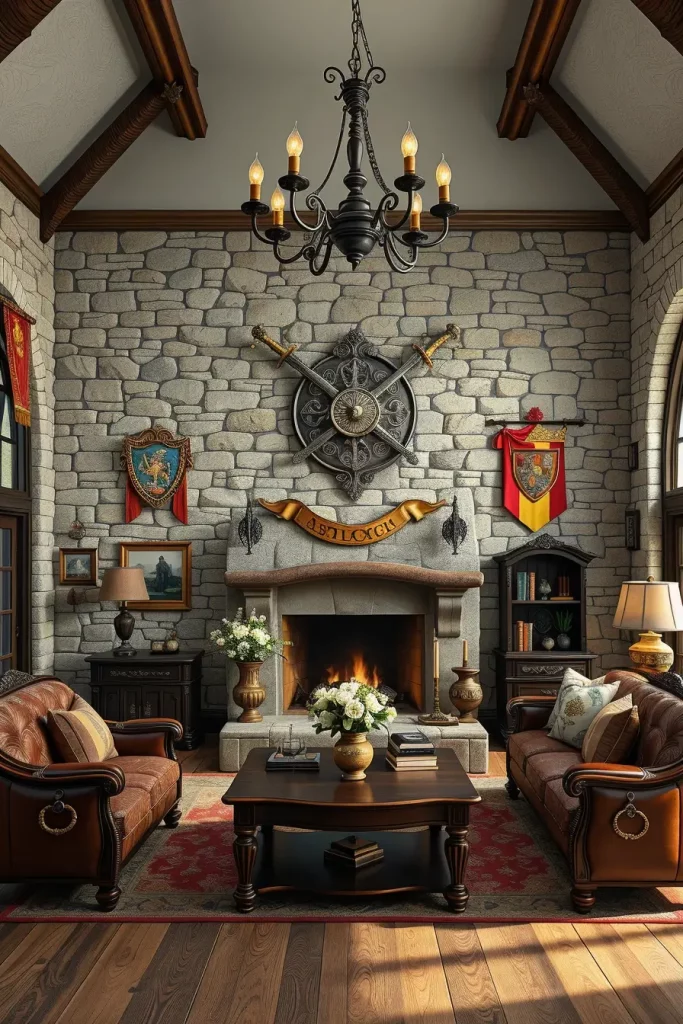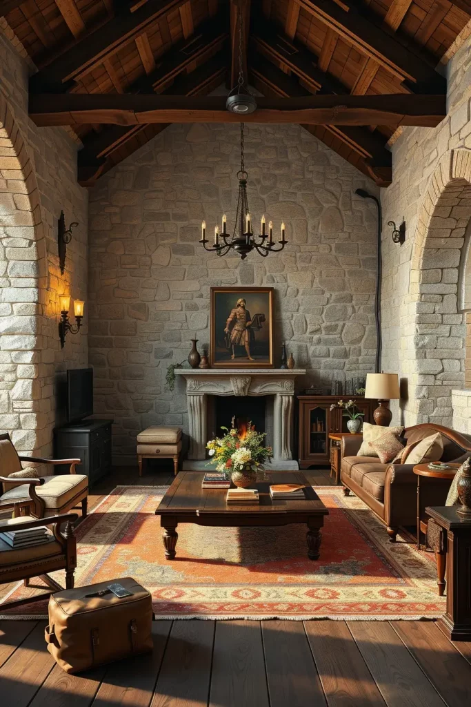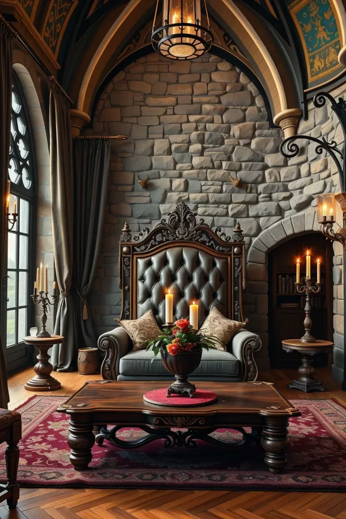 In my opinion, stone walls are the best way to decorate a Castlecore living room. You can use exposed natural stone or faux-stone panels, or textured wallpapers, and these surfaces instantly give you the impression of old-world architecture. Not only dramatic but also a practical background that is compatible with warm lighting and darker furniture.