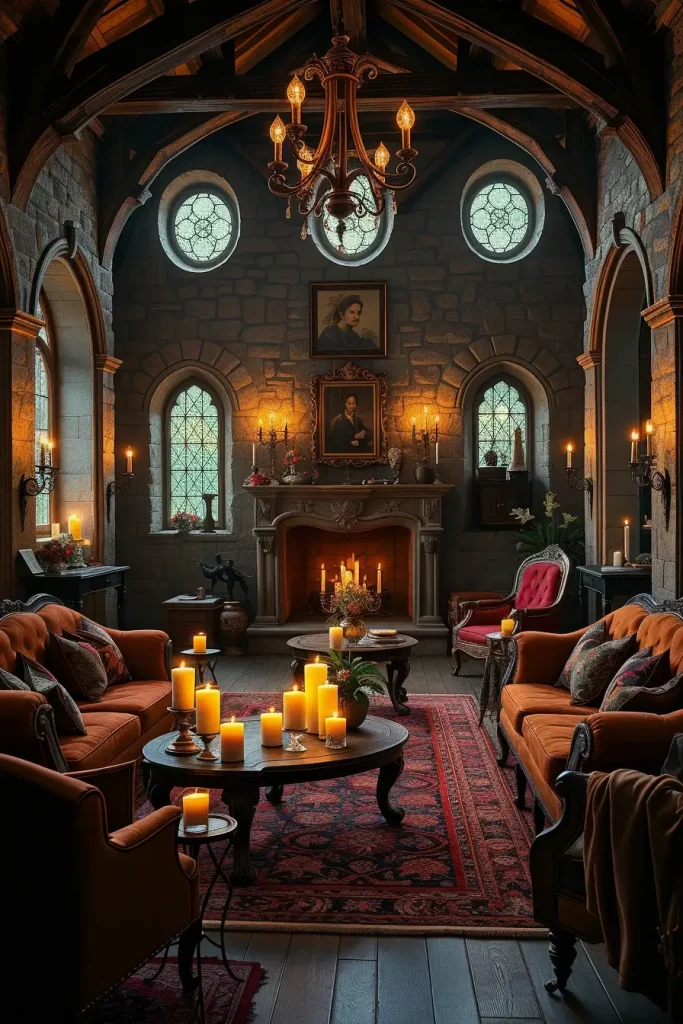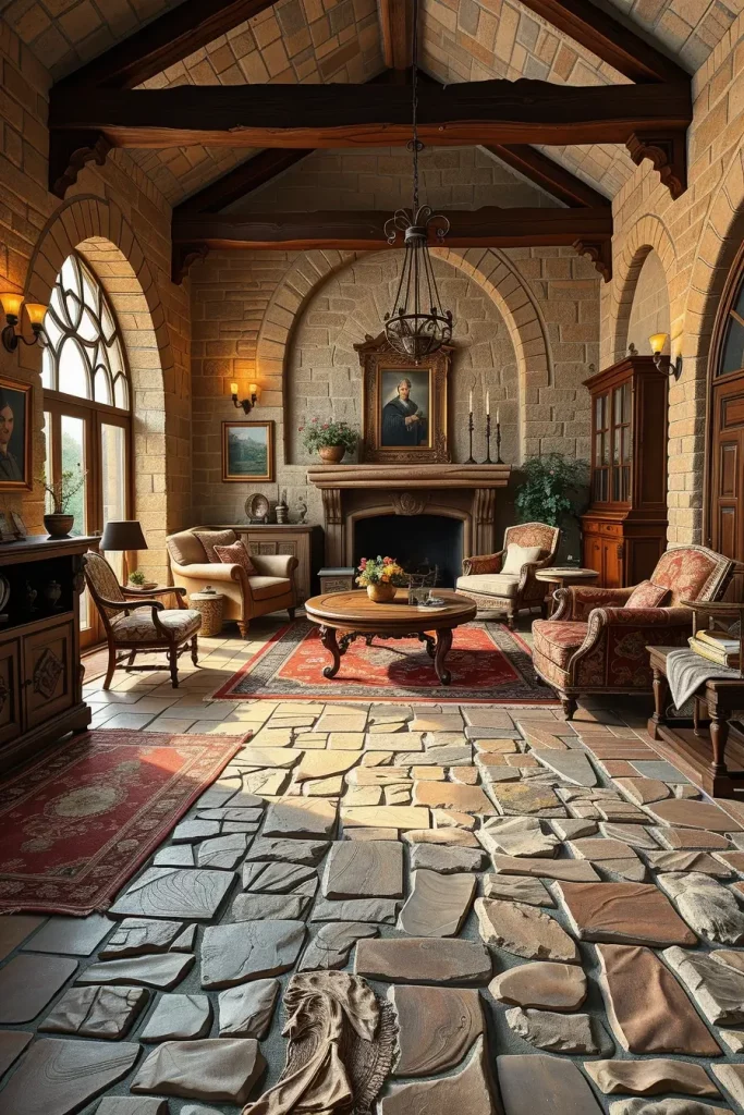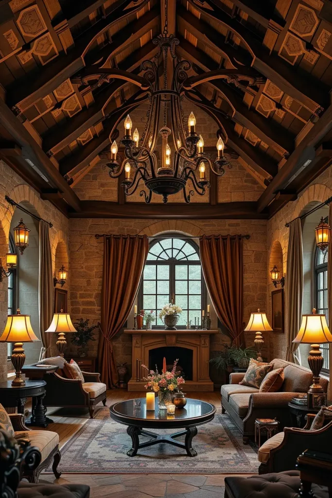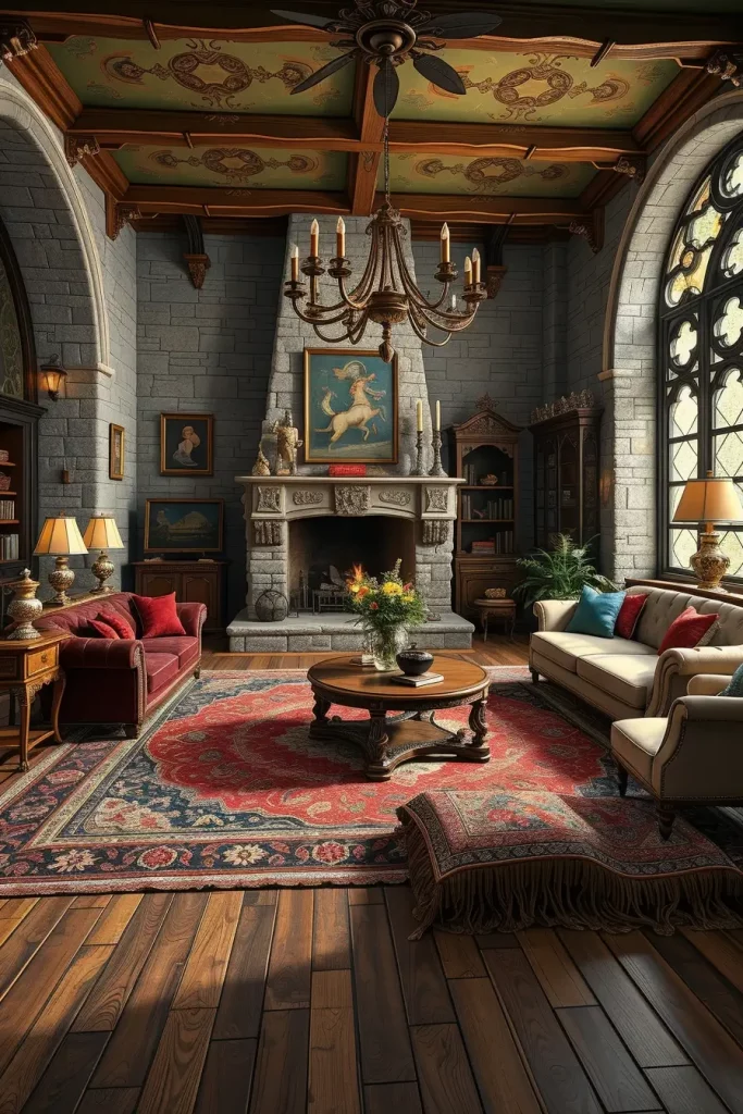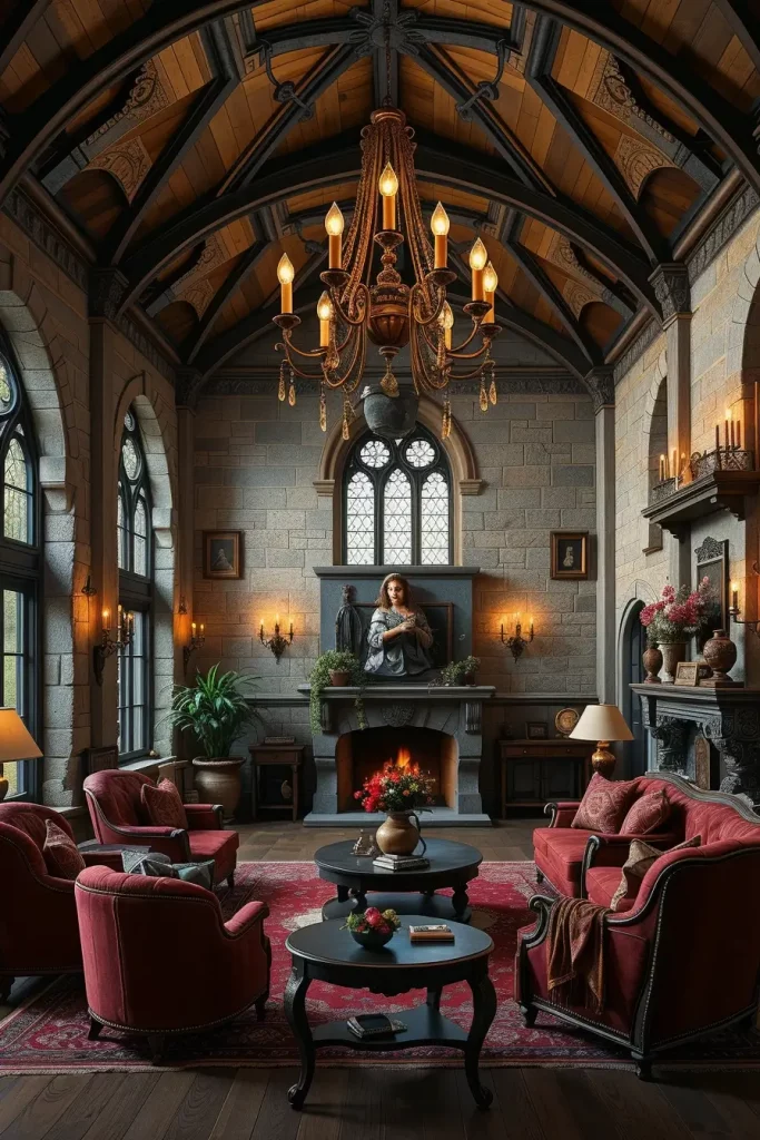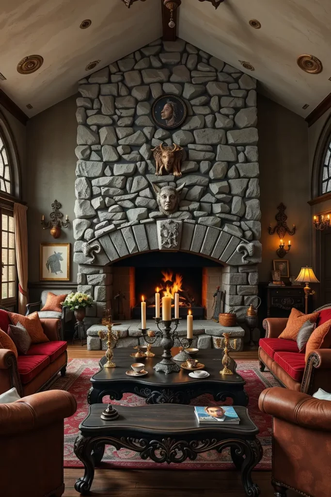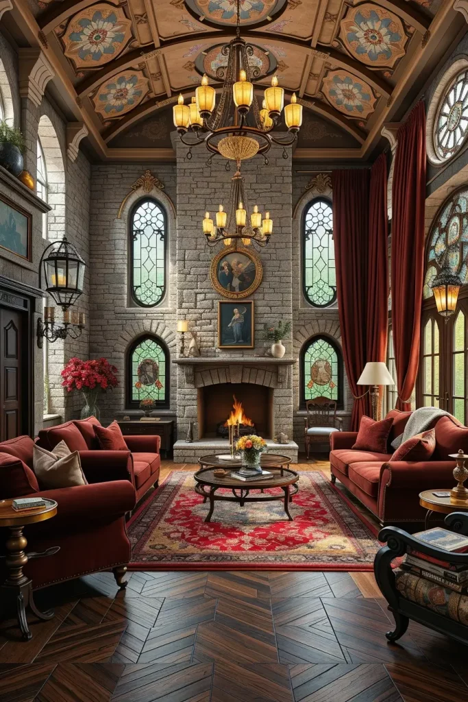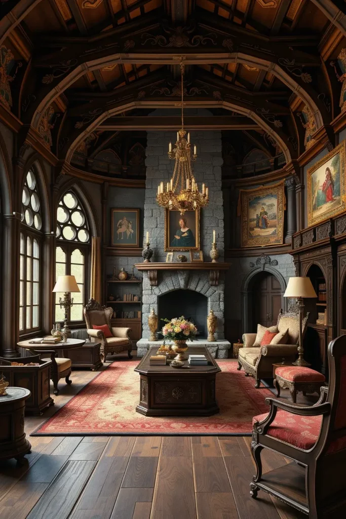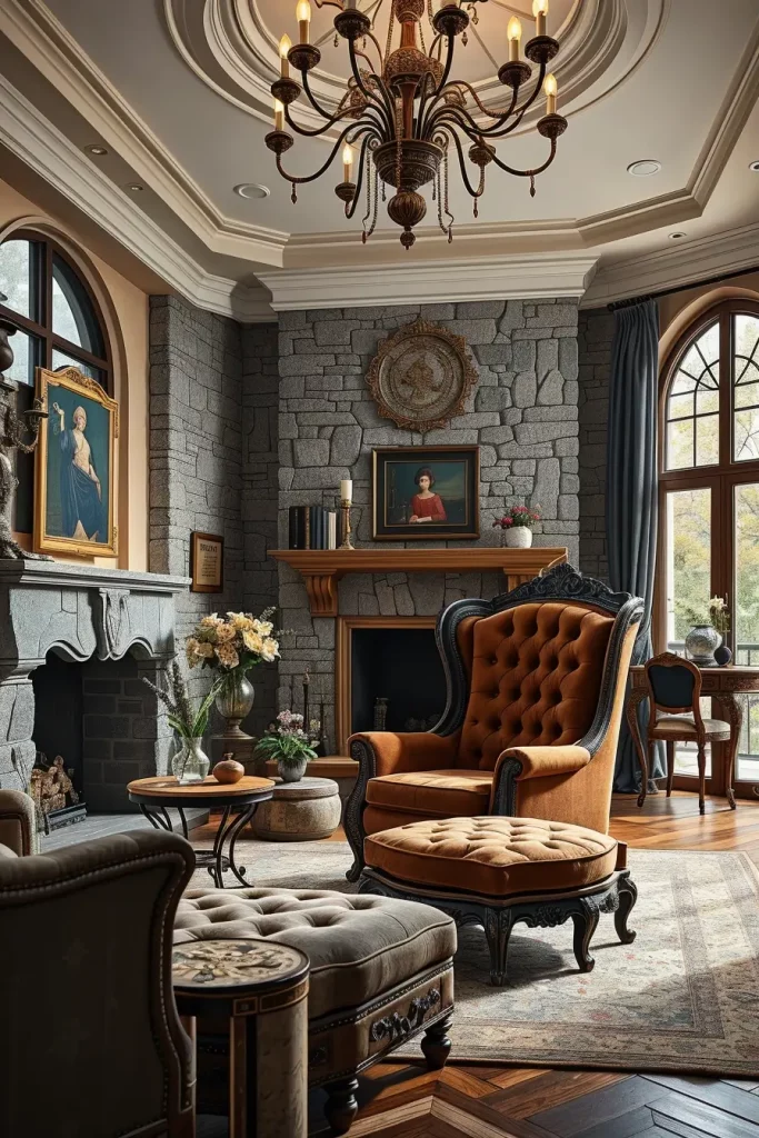 In my opinion, stone walls are the best way to decorate a Castlecore living room. You can use exposed natural stone or faux-stone panels, or textured wallpapers, and these surfaces instantly give you the impression of old-world architecture. Not only dramatic but also a practical background that is compatible with warm lighting and darker furniture.