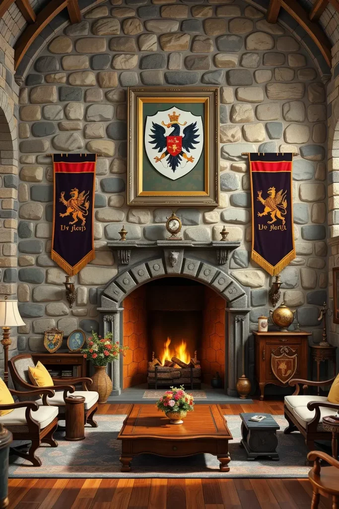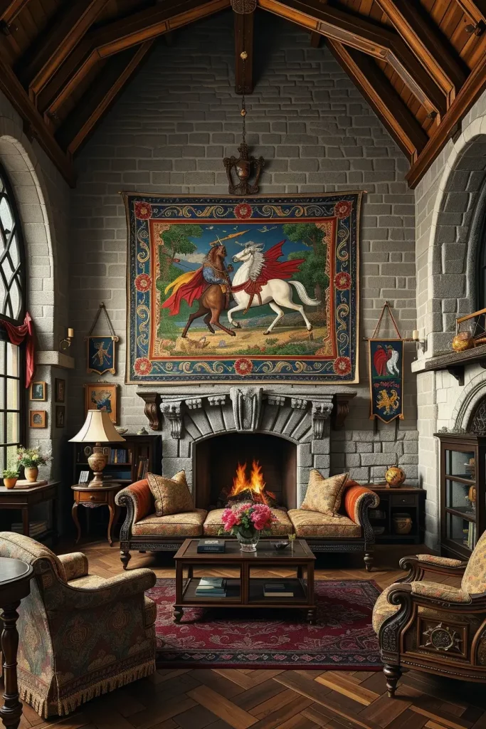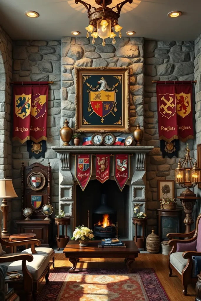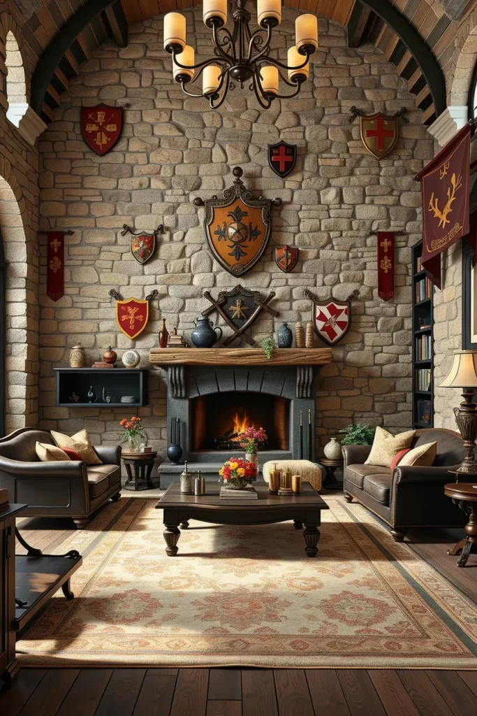 I prefer to hang a framed coat of arms over the fireplace or to hang fabric banners in alcoves. Ornamental wall plaques and even embroidered cushions with heraldic patterns contribute to the unification of the theme without overloading the room. These works are usually best used together with stone or wood backgrounds.