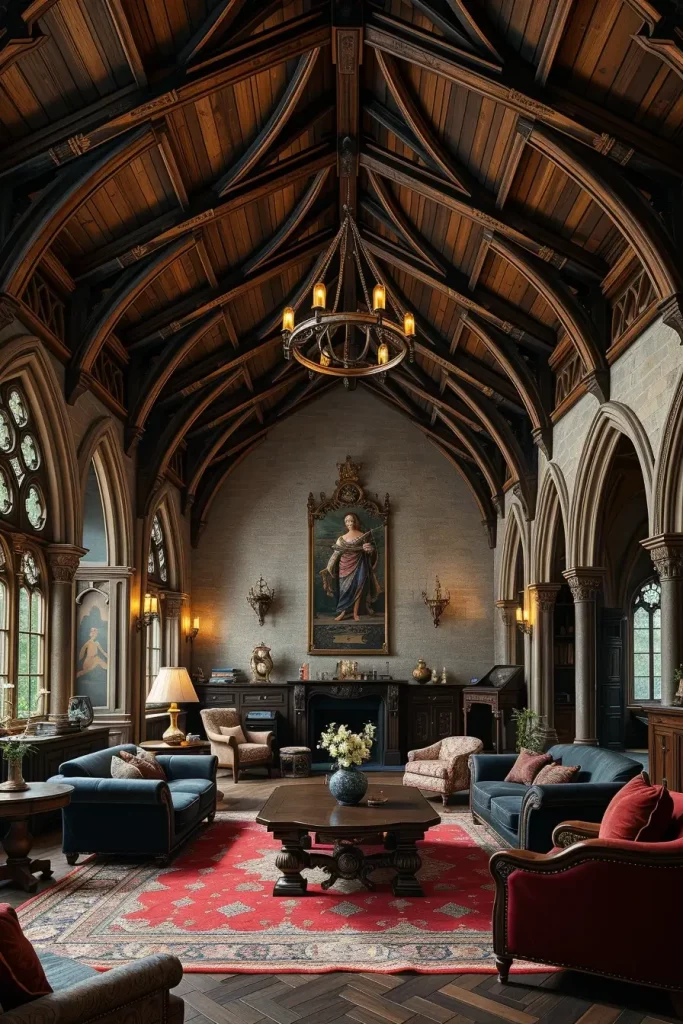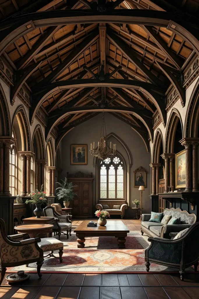 The wooden beams and gothic arches added to a Castlecore living room add structure and drama. Not only are these architectural features aesthetically pleasing, but they are also functional, contributing to the definition of the spaces and offering durability.