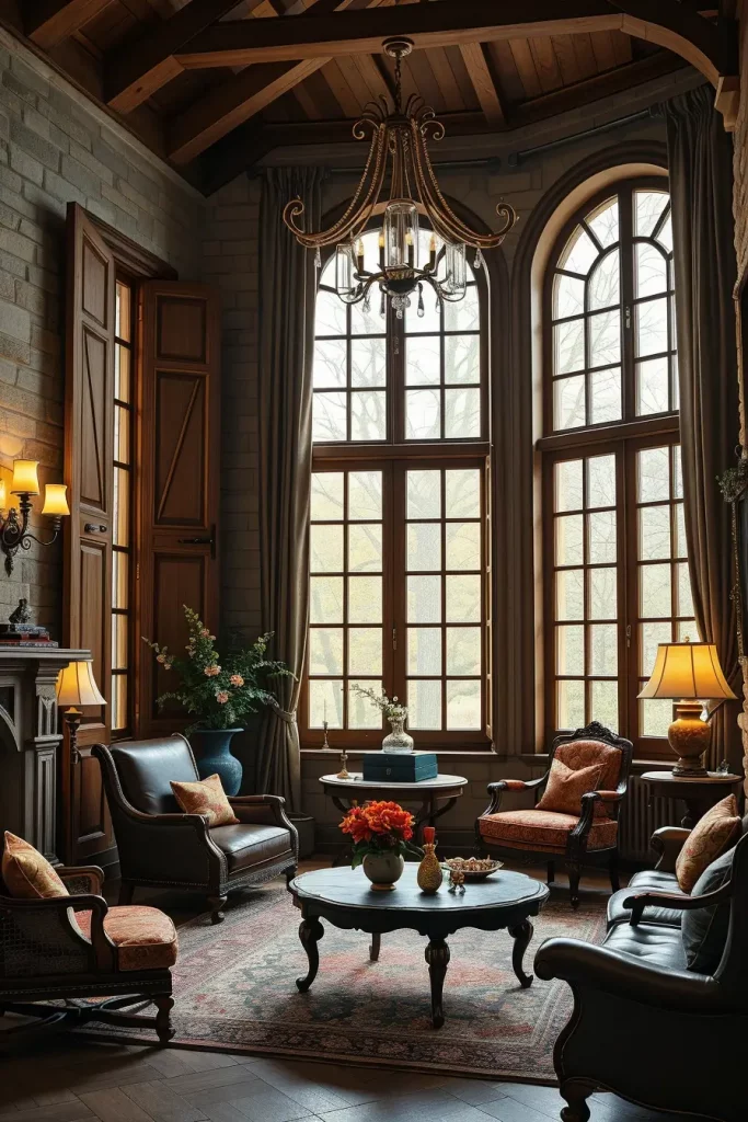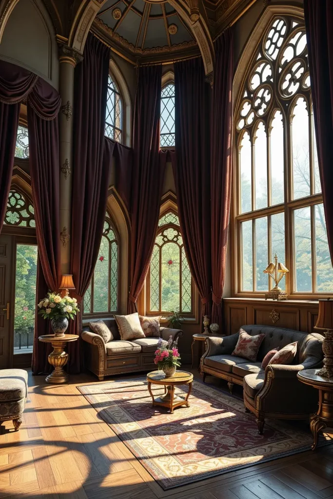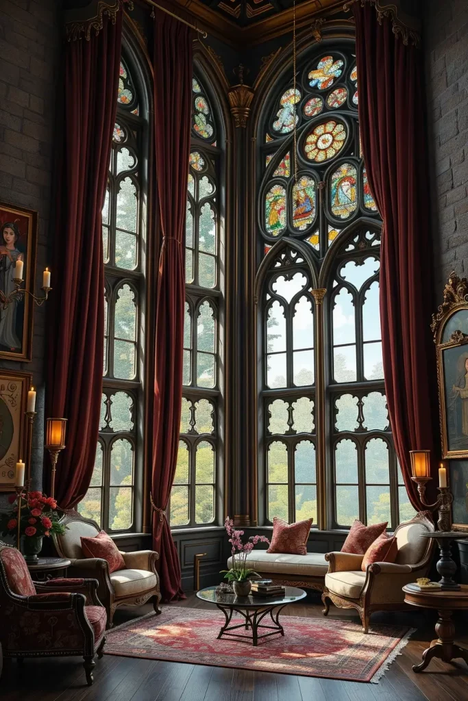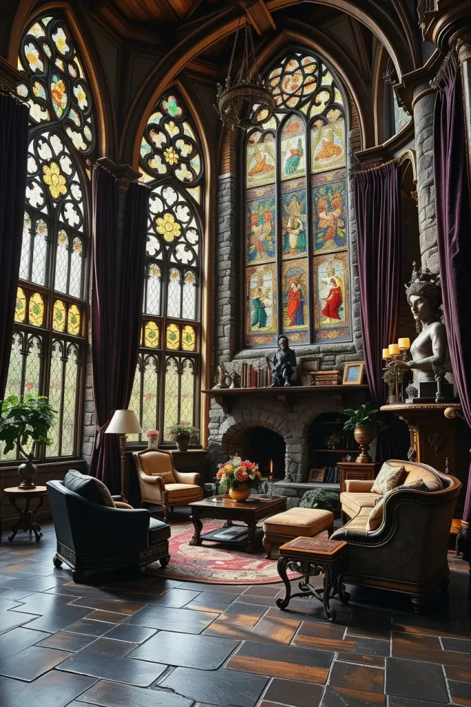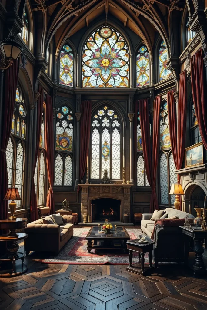 In furnishings, I usually recommend the use of stained glass on tower windows or inside smaller panels on side walls. This is in perfect contrast with dark wood furniture and heavy velvet curtains, where the filtered light is reflected on deeply textured fabrics. The effect can be echoed in a faint manner by small stained glass lamps or tabletop accents.
