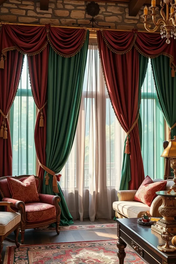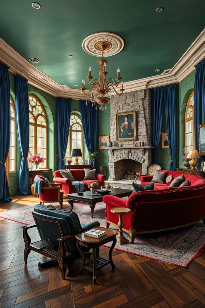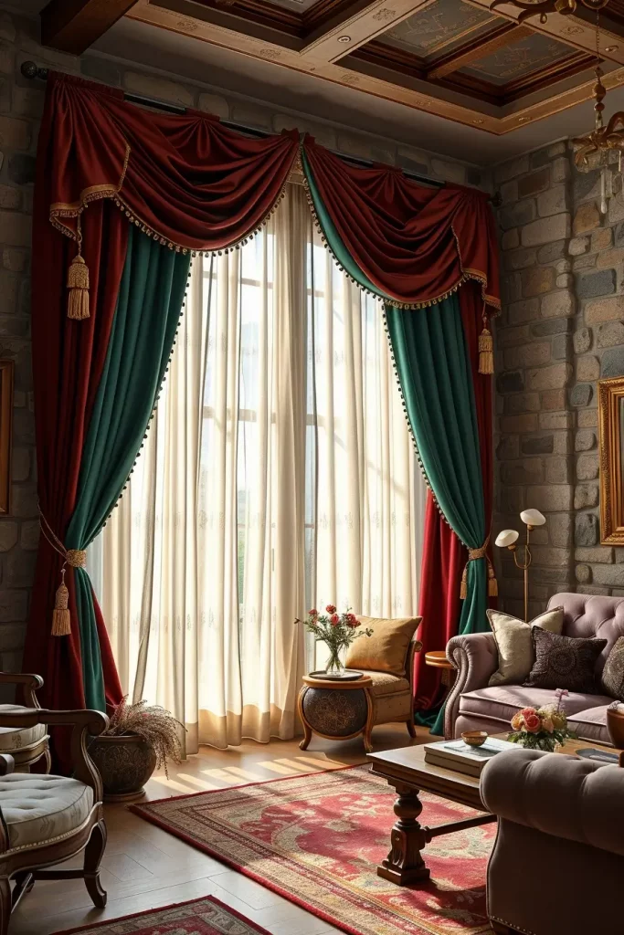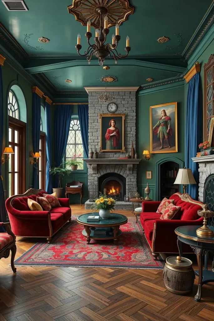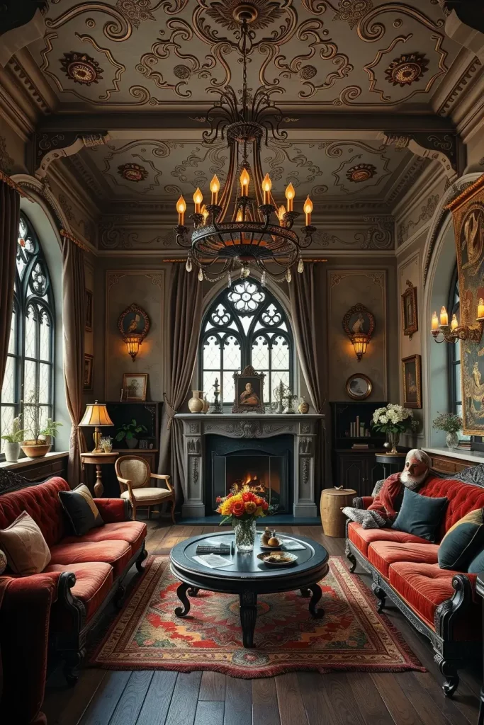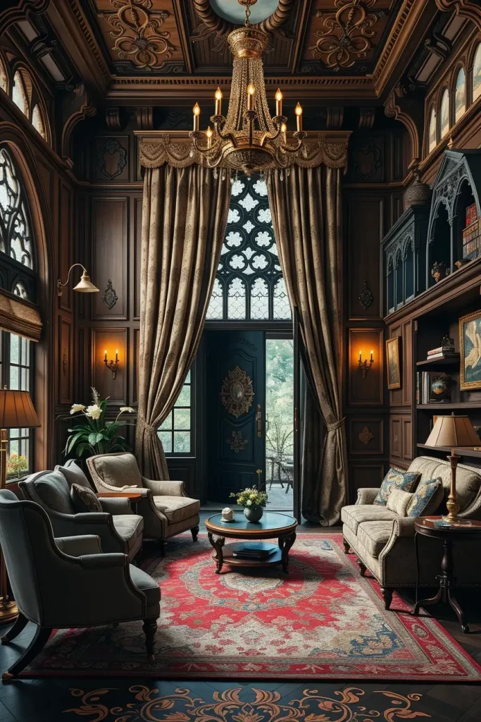 I think Castlecore interiors must have heavy drapery. Velvet, brocade or highly patterned curtains create drama and also regulate light. They provide the living room with privacy and splendor.