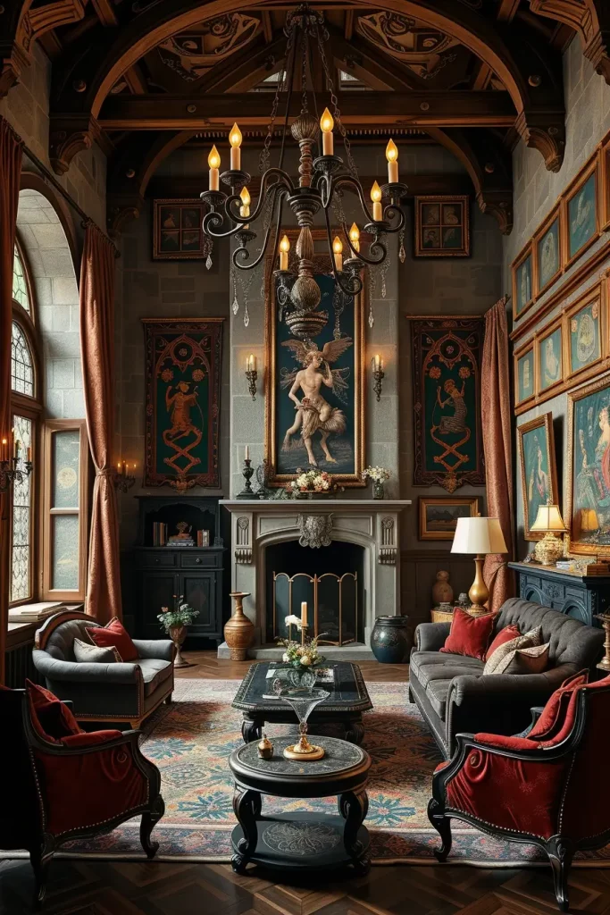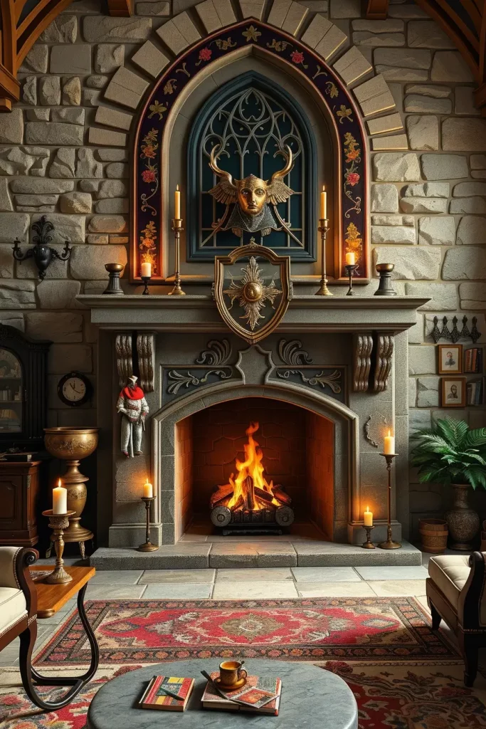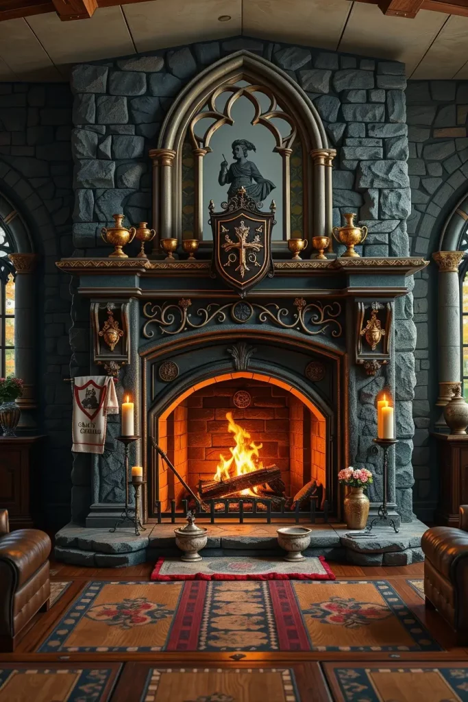 I tend to decorate mantels with huge candlesticks, wrought iron lanterns or even imitations of medieval chalices. Shields, miniature sculptures or tapestries hung over the mantel are layered to give an old-world effect. An arch-framed gothic mirror mounted on a wall also adds to the medieval atmosphere as it reflects warm light throughout the room.