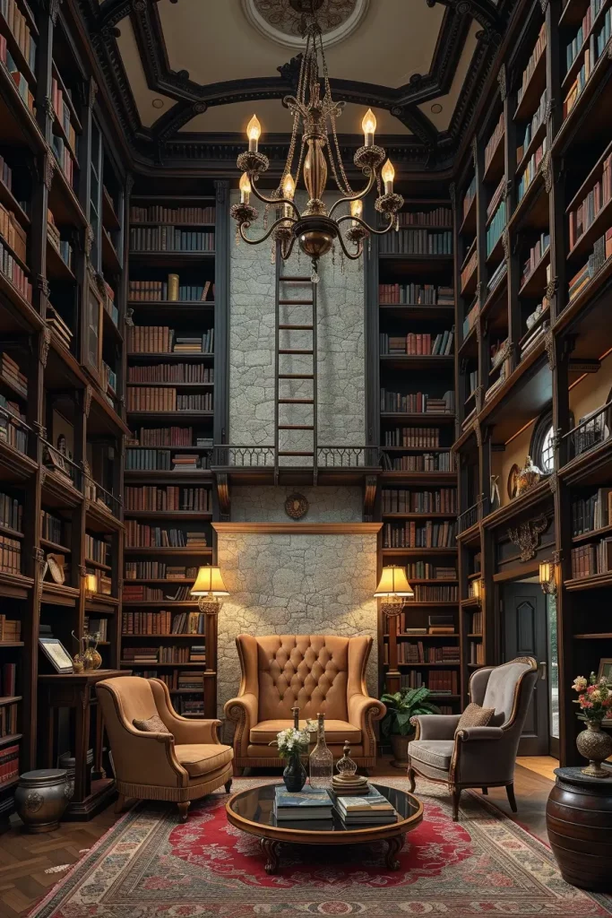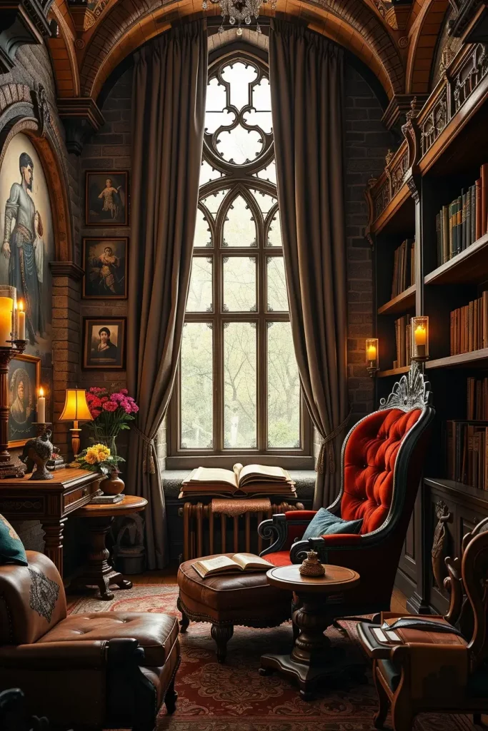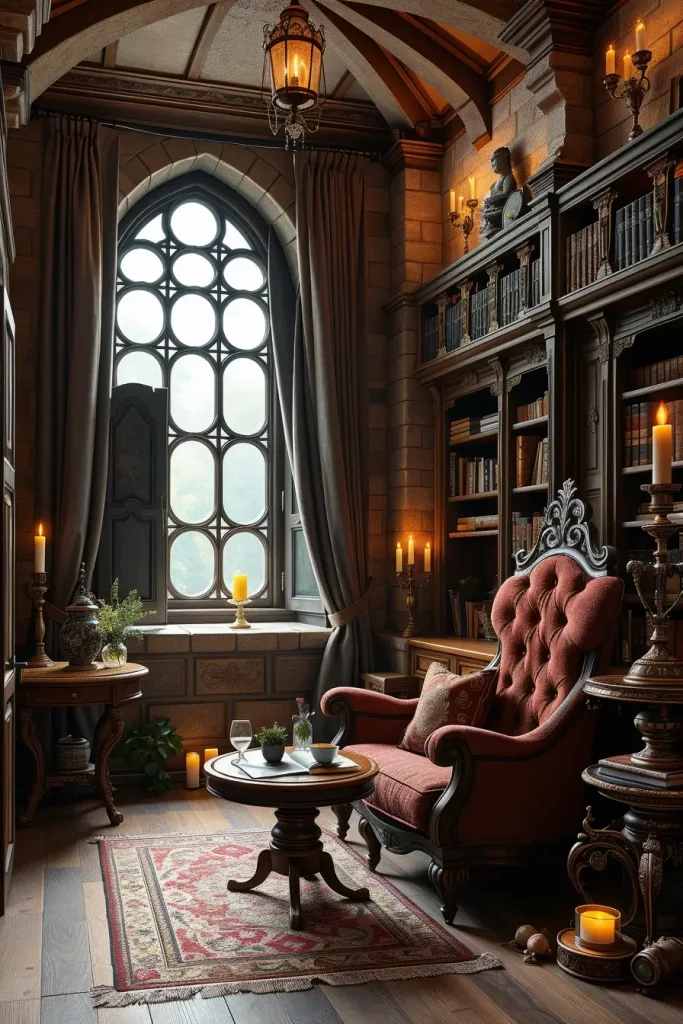 A Castlecore living room would not be complete without high book shelves or even a library corner. I have always felt that shelves with books, scrolls and ornaments immediately give a scholarly and royal atmosphere. They are also functional, which means that they offer storage and display opportunities.