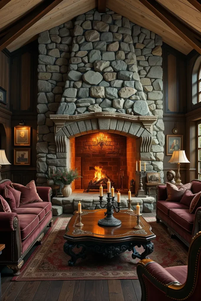 The furniture must be placed to match the fireplace. The arrangement of velvet sofas, armchairs, and wooden coffee tables around the place will form a natural sitting area. The effect of history can be further added by adding wrought iron candle holders or sconces above the mantel.