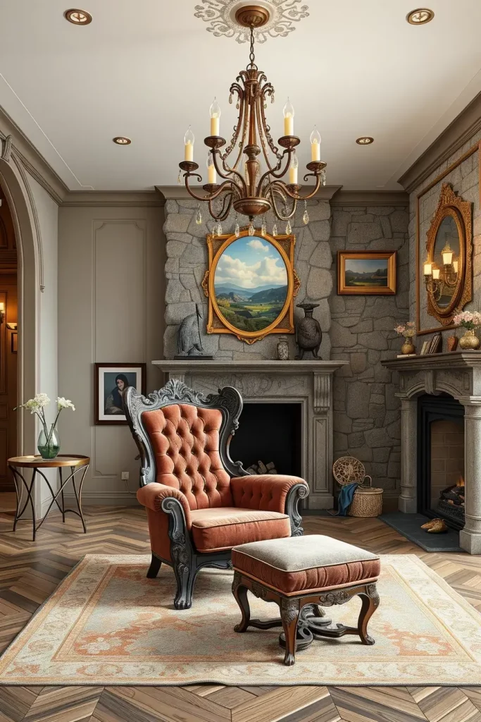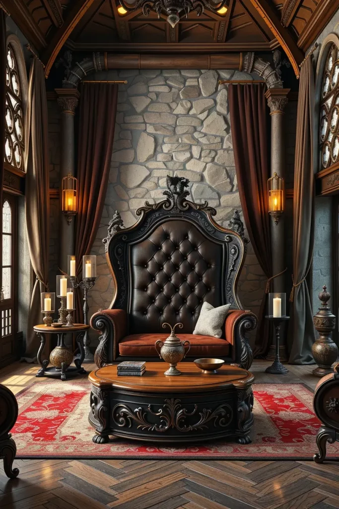 All Castlecore living rooms enjoy the advantage of a theatrical point of focus, and throne-like seating is the best way to evoke the atmosphere of medieval interiors. This does not imply a copy of a big royal chair, but an introduction of a high-backed seat, bold in design, which grounds the room. I have discovered that such a work instantly draws the eye and makes the room feel like a royal one.