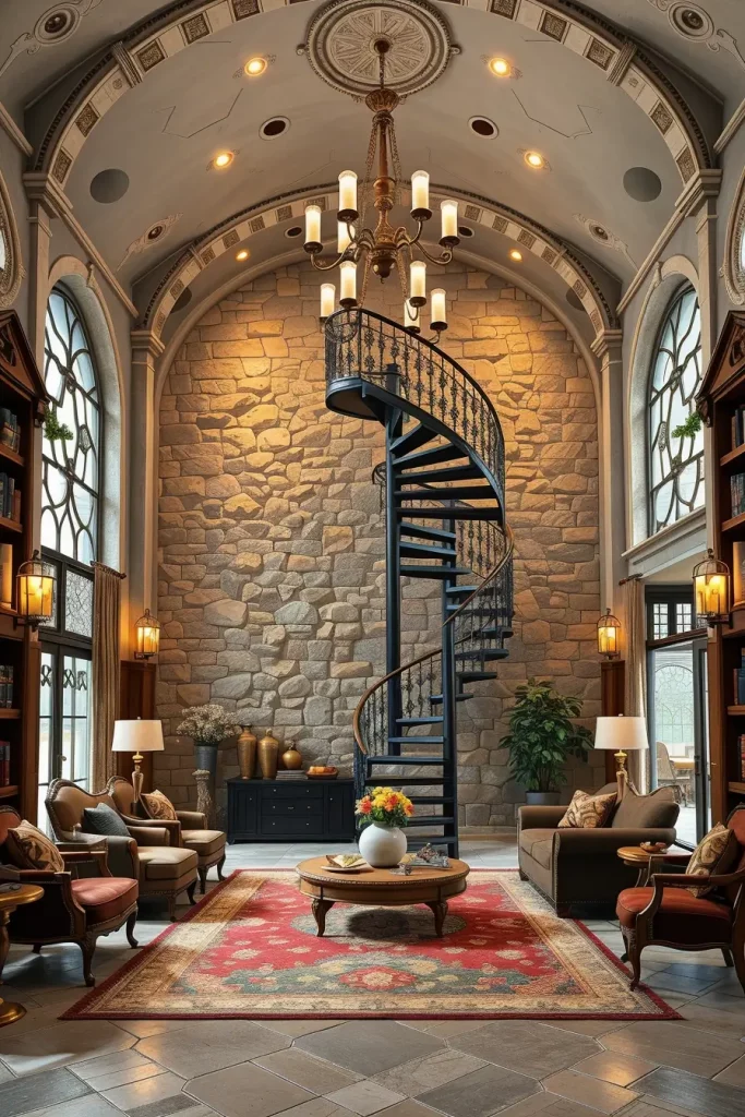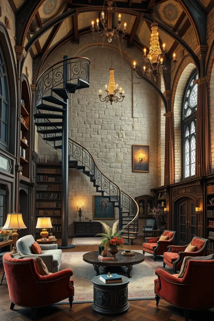 One of the most recognizable elements that can be used to make a space look like a Castlecore is a spiral staircase. In designing such living rooms, I look at the staircase as a functional architecture but also as a sculptural focal point.