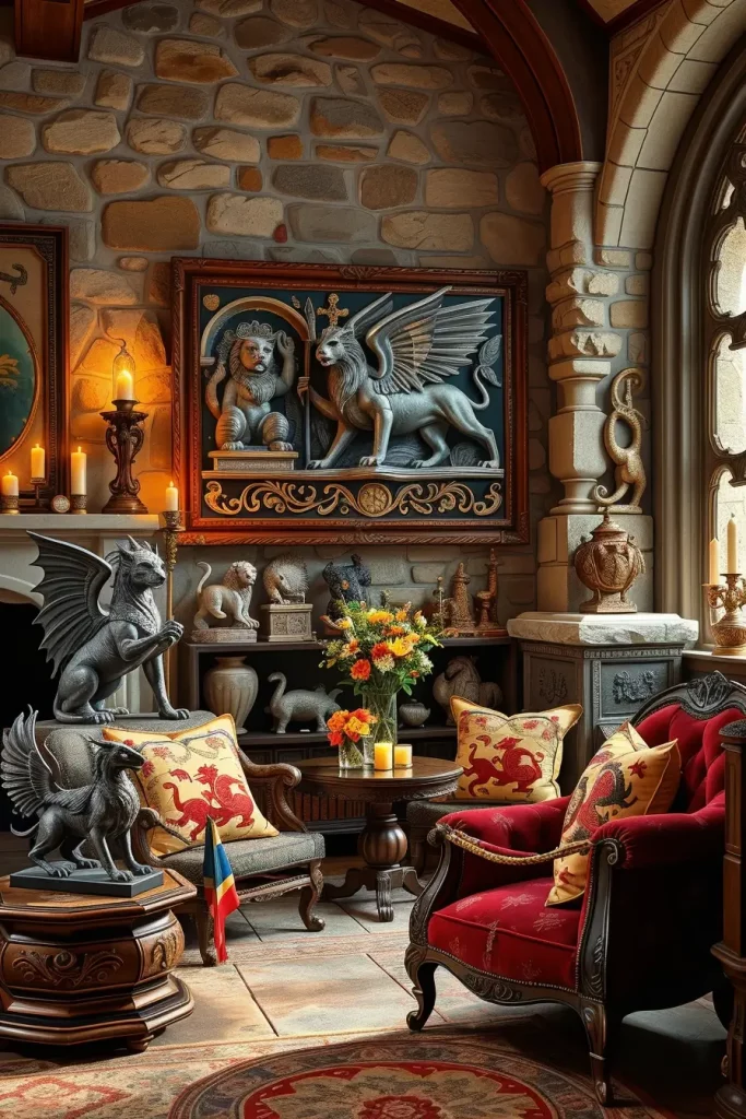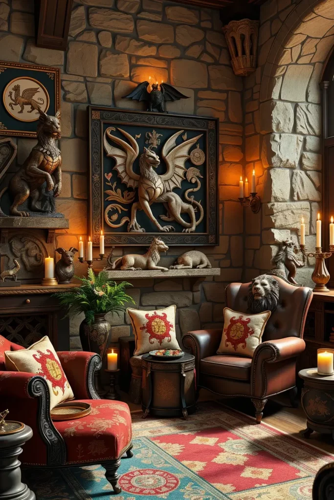 I always thought that the Castlecore design must have an element of telling a story and animal symbols or mythological creatures are the best. Medieval heraldry frequently features lions, dragons, griffins, and stags, and can be incorporated into the decor of the living room in subtle but impactful ways.