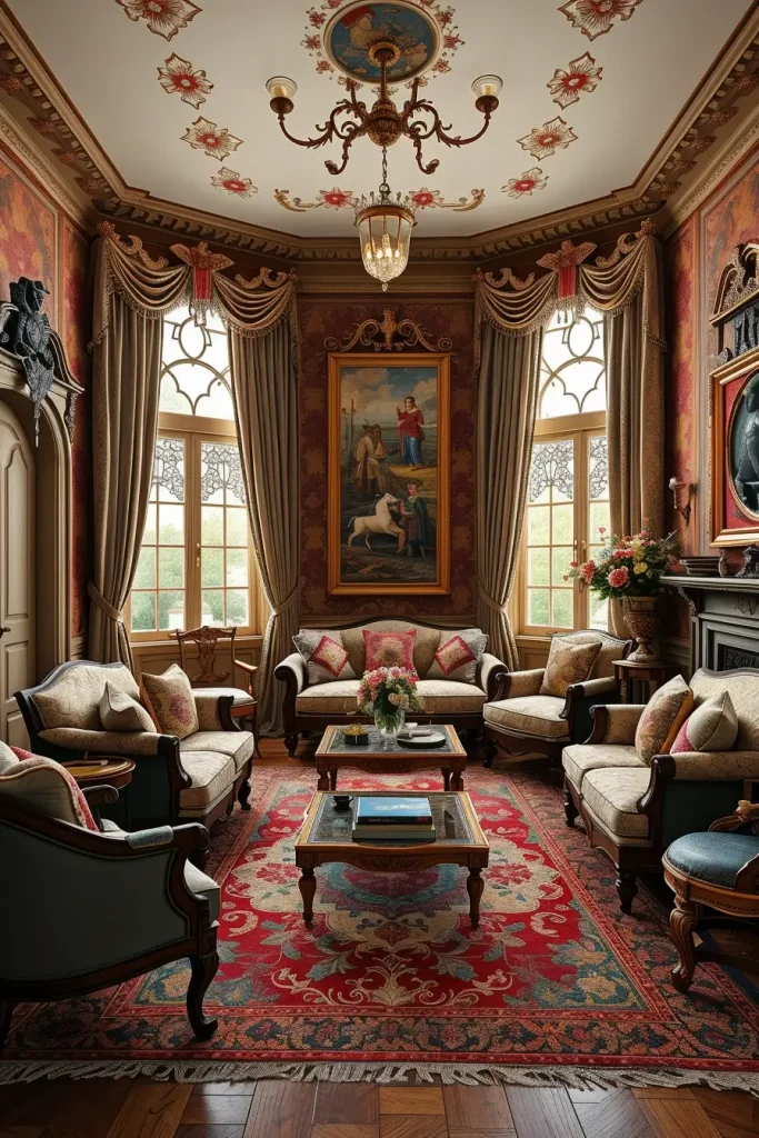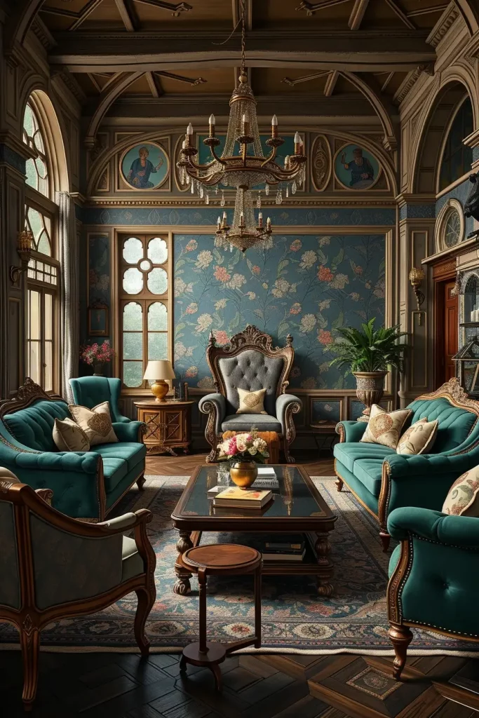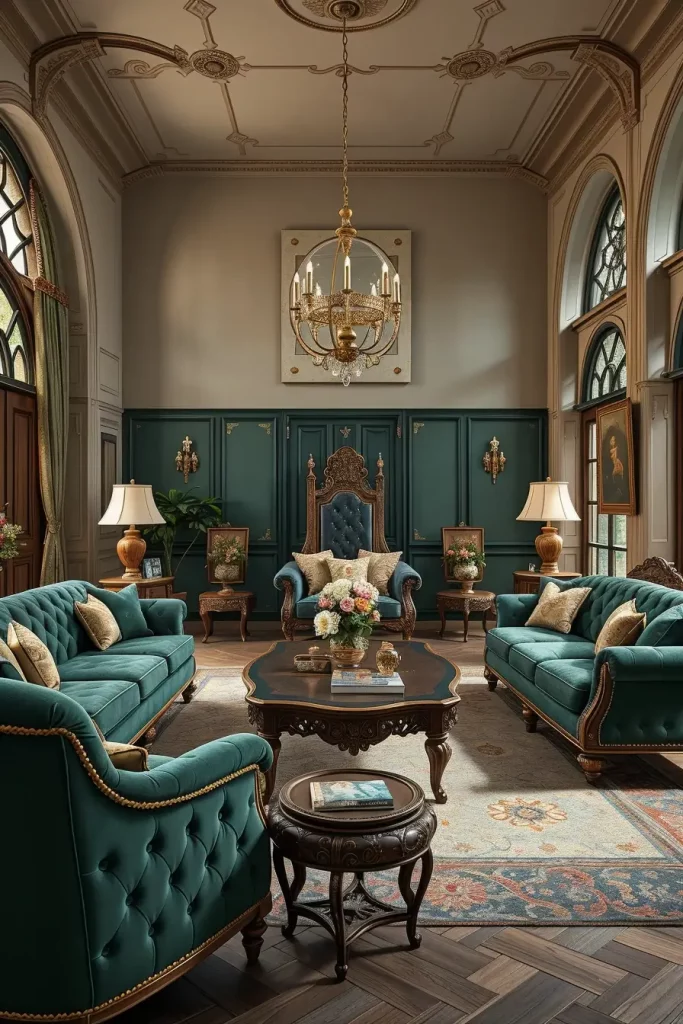 The sitting arrangement is also important. The addition of sofas, tufted armchairs, carved wooden benches, or even a high-backed throne-like chair prepares the scene of royal comfort. Velvet upholstery is perfect with coffee tables that have fancy legs or inlaid with brass.