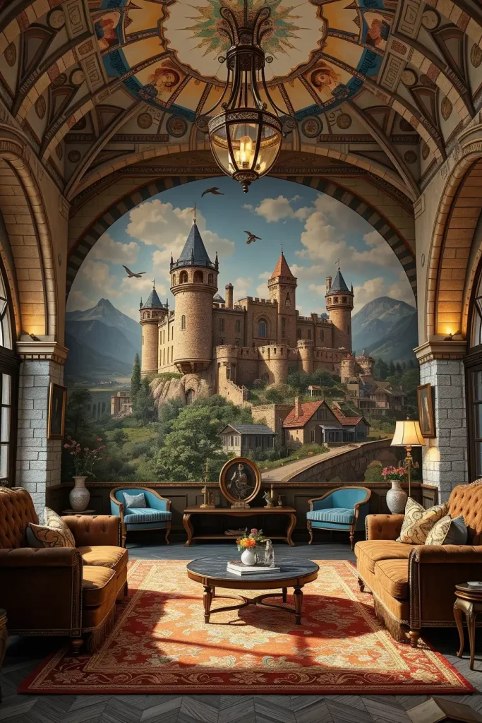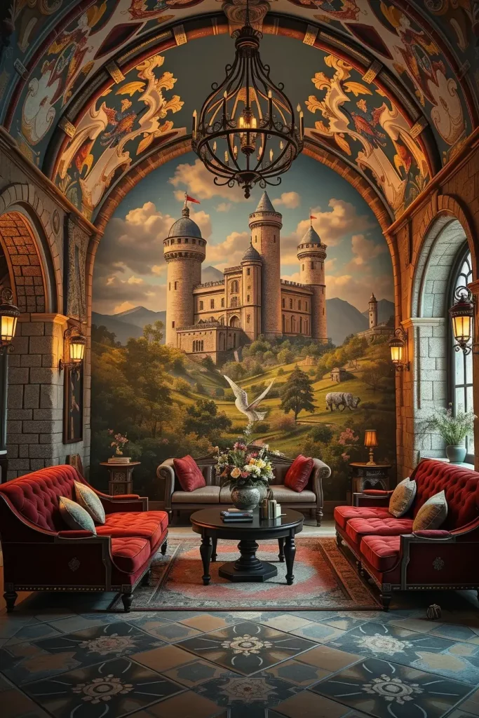Wall murals or fresco-type paintings on a large scale are a great way to ground a Castlecore living room. Whenever I have used them, they instantly turn a boring wall into an amazing piece of art that feels like it was taken out of history.