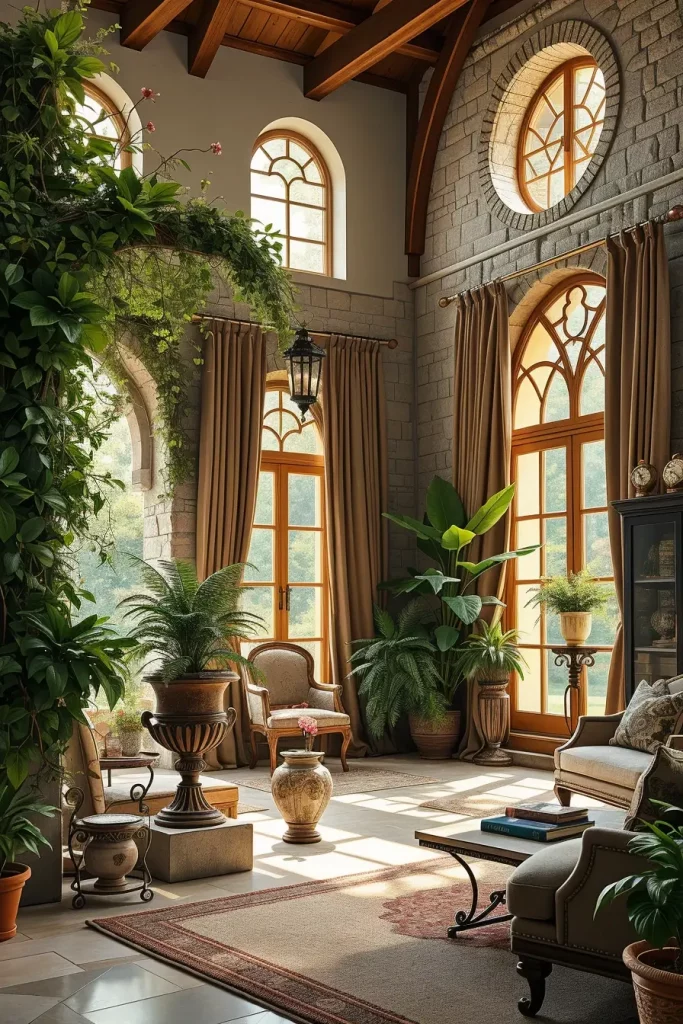 What I would include here is climbing plants or trellises that are located inside the home close to windows. They reflect the appearance of the castle courtyards and the movement between the outdoor and indoor space is smooth.