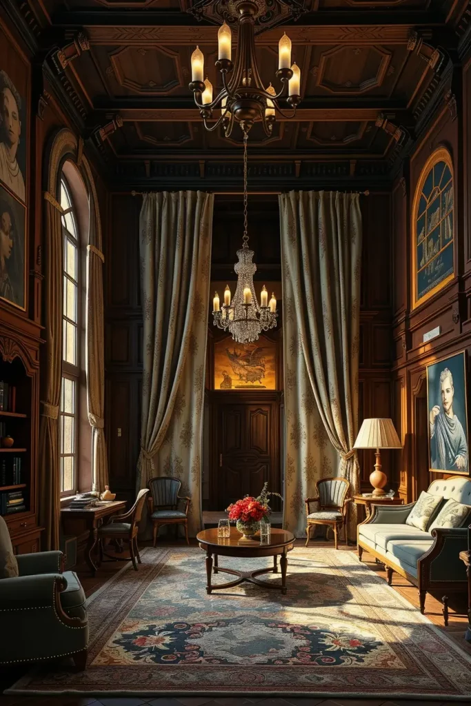 Dark wood furniture, tapestries, and chandeliers may be considered the staples of such rooms, giving them a gentle medieval light. All pieces contribute to the grounding of the aesthetic and have a functional purpose. They can be incorporated into the atmosphere, such as the heavy curtains, but they can also be incorporated to insulate, and also to provide warmth and texture, such as the decorative rugs.