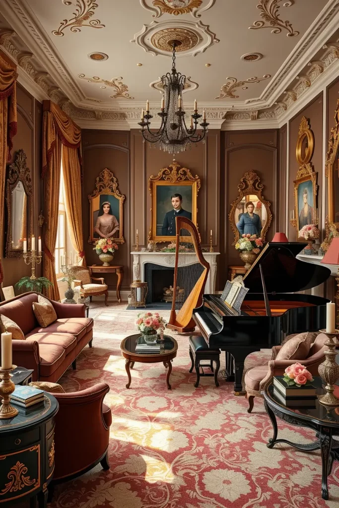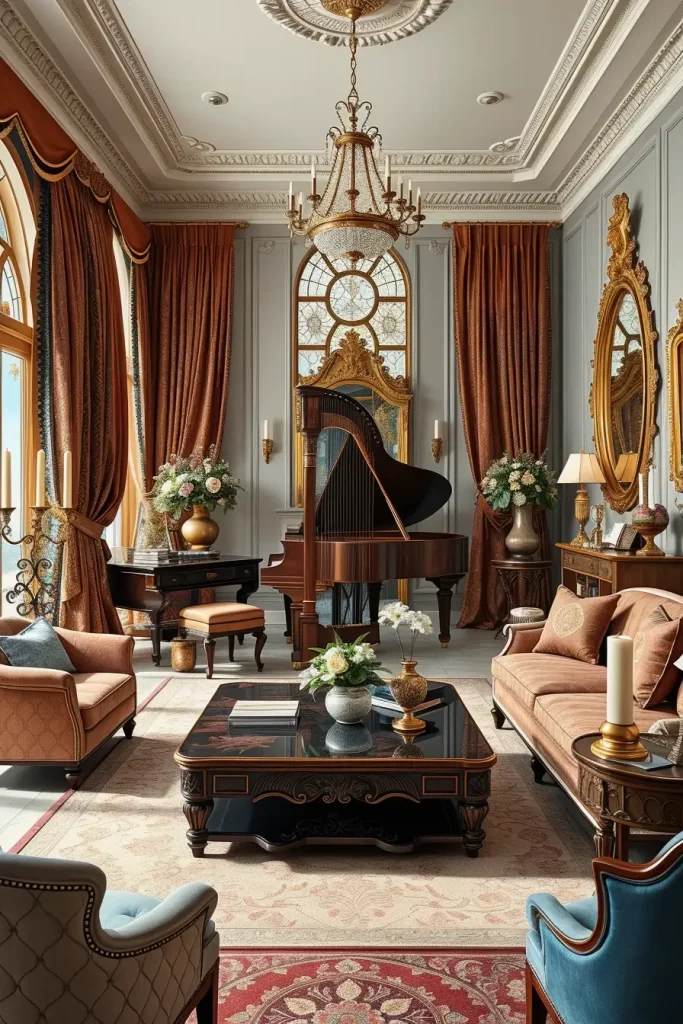 A polished black or deep mahogany grand piano is a perfect match to velvet seating and gilded mirrors in terms of specific furnishings. A harp, with its elaborate carvings, is a good sculptural object in front of a window bordered with heavy brocade curtains. I suggest adding accent tables in wrought iron or dark wood and candleholders to supplement these large instruments to complete the medieval atmosphere.