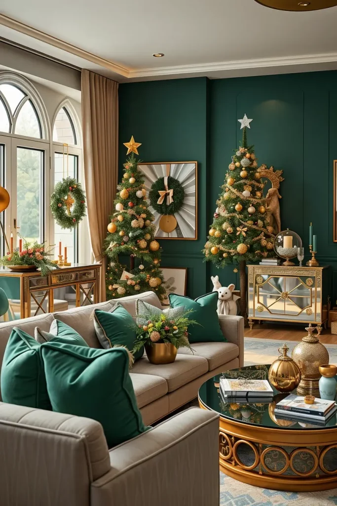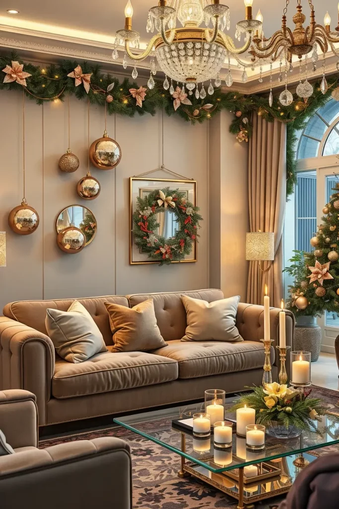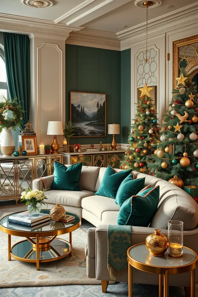 In furniture, I prefer neutral toned sofas or armchairs which give a tone of balance to the vibrant colors. The refrigerators and sideboards are mirrored with glass or mirrors to make the rooms seem deeper than they are with the glittering lights of the Christmas tree and garlands. I would as well suggest the combination of textures such as velvet cushions and matte ceramic vases to add richness and contrast.