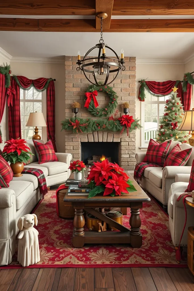 I would like to ground red and green in nature (in plaid throws, velvet cushions, arrangements of poinsettia, fresh evergreen garlands). The neutral color upholster furniture offers balance and the rustic wooden tables are used to anchor the burst of colors.