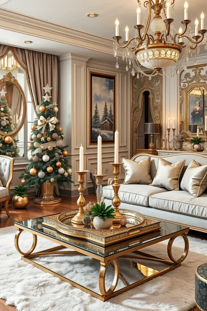 In my case, the items that are fundamental include metallic decorations, gilded candelabra and silver-bordered plates. The theme is united by a plush sofa and metallic accent cushions and a glass coffee table adorned with reflective trays. The look is complemented with elegant chandeliers or pendant lighting.