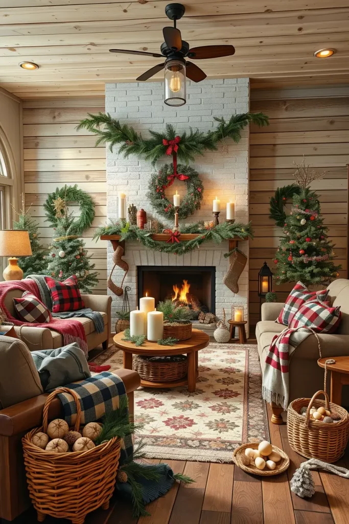 To create rustic interiors, I utilize wooden pieces of furniture with the visible grain, plaid throws, and greenery in the form of branches of cedar or pine. There are mason jars with candles, wooden ornaments that are made using the hands of people and wicker baskets that make the place authentic. The warmest, cabin-like impression is added by the fireplace framed with natural garlands.