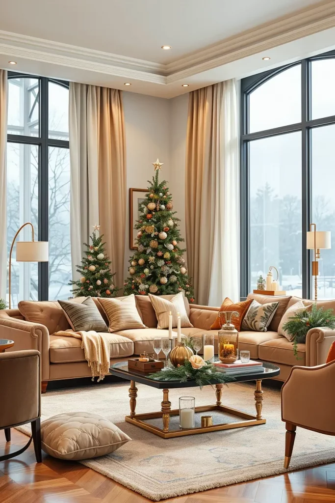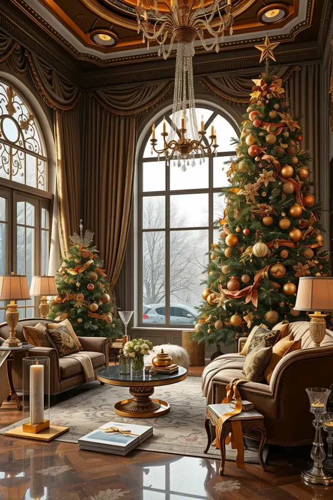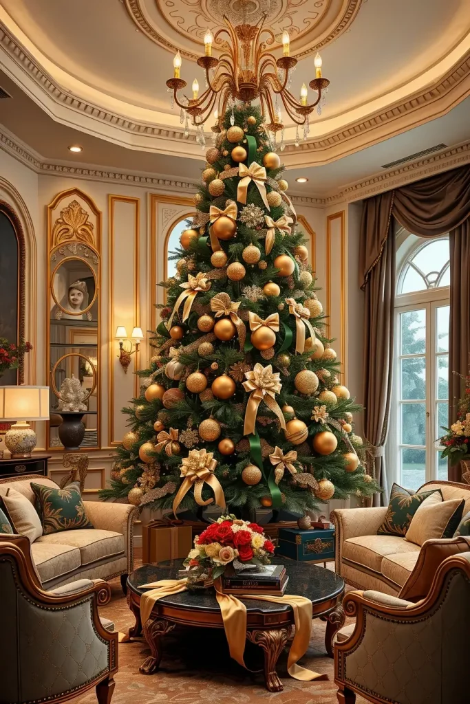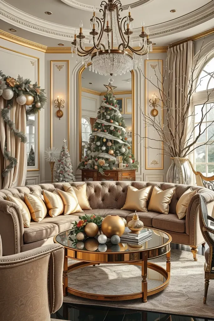 I will suggest to use metallic colors like gold, silver or champagne combined with dark jewel colours like emerald, navy or burgundy. A living room can be turned into a posh holiday with velvet cushions, silk ribbons and ornaments made of crystal. The big statement trees with unified color palette are also a major element of luxury design.