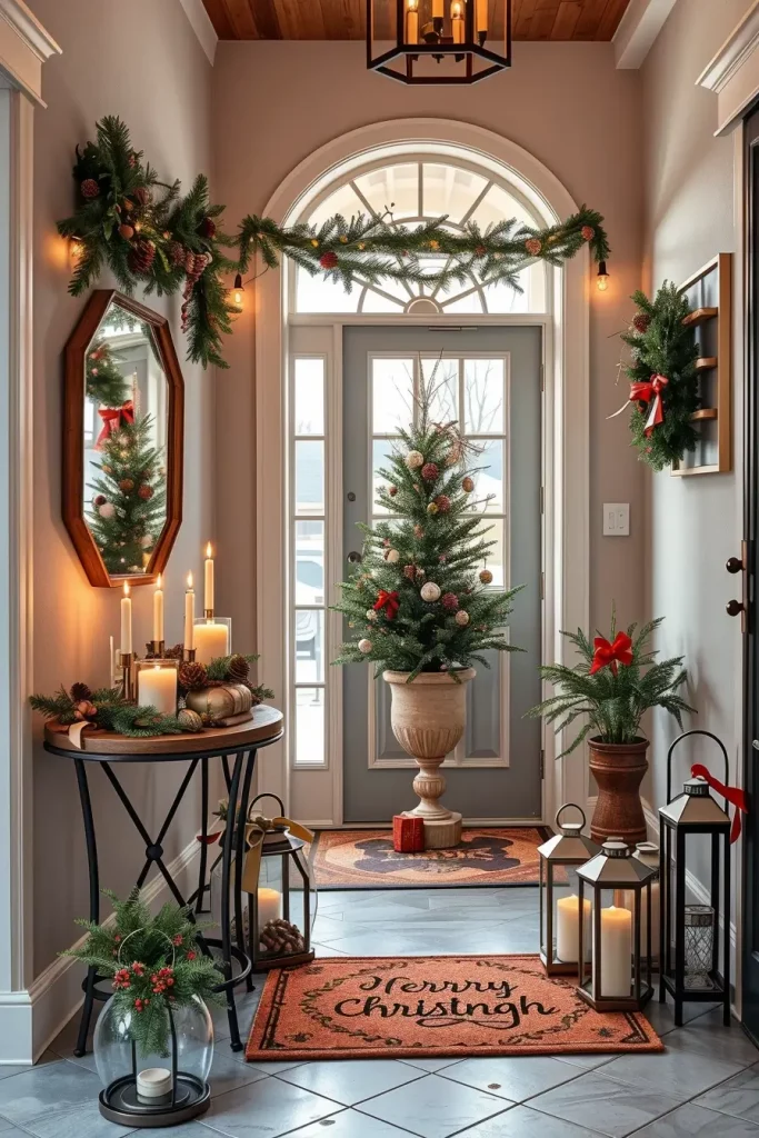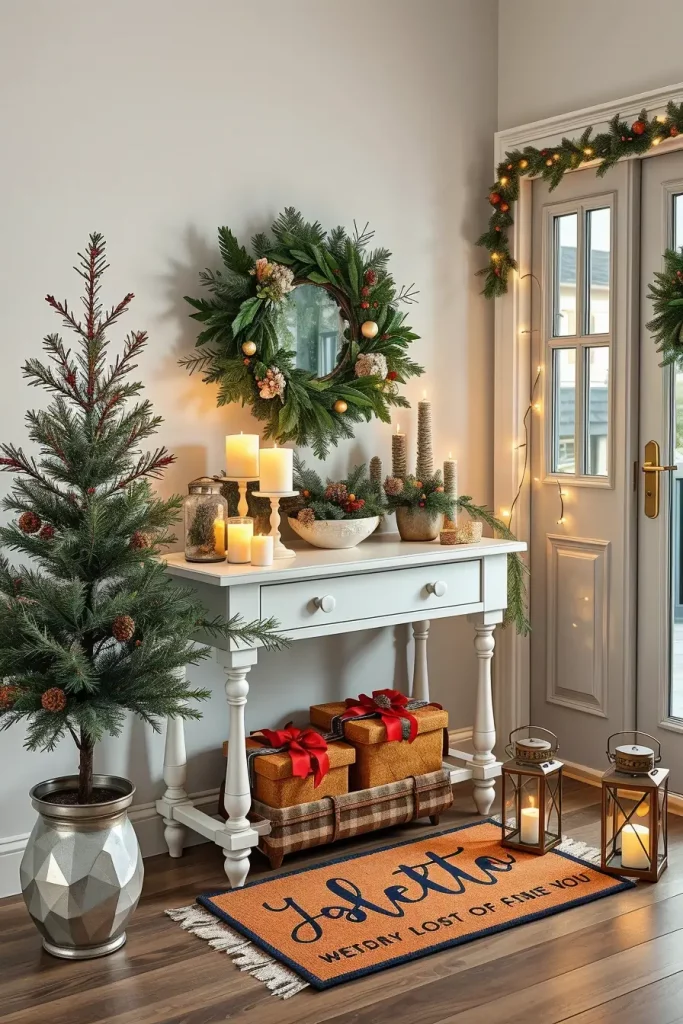 The door predetermines the overall atmosphere at home holidays. Once the guests get there, their initial impression must be made to be celebratory and welcoming. I also prefer to mix greenery, garlands and twinkling lights to make foyers alive and cozy.