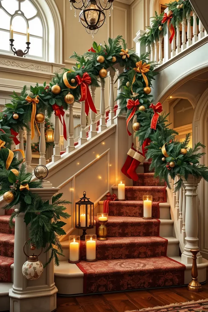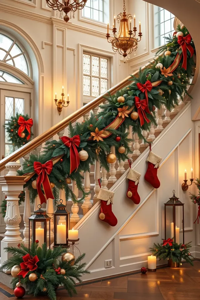 In order to attain the desired appearance, I would recommend covering the railings with rich greenery with ribbons of gold, red, or even dark blue to give it a contemporary feel. Gluing little ornaments or stockings on the staircase makes it more attractive and a center of attention.