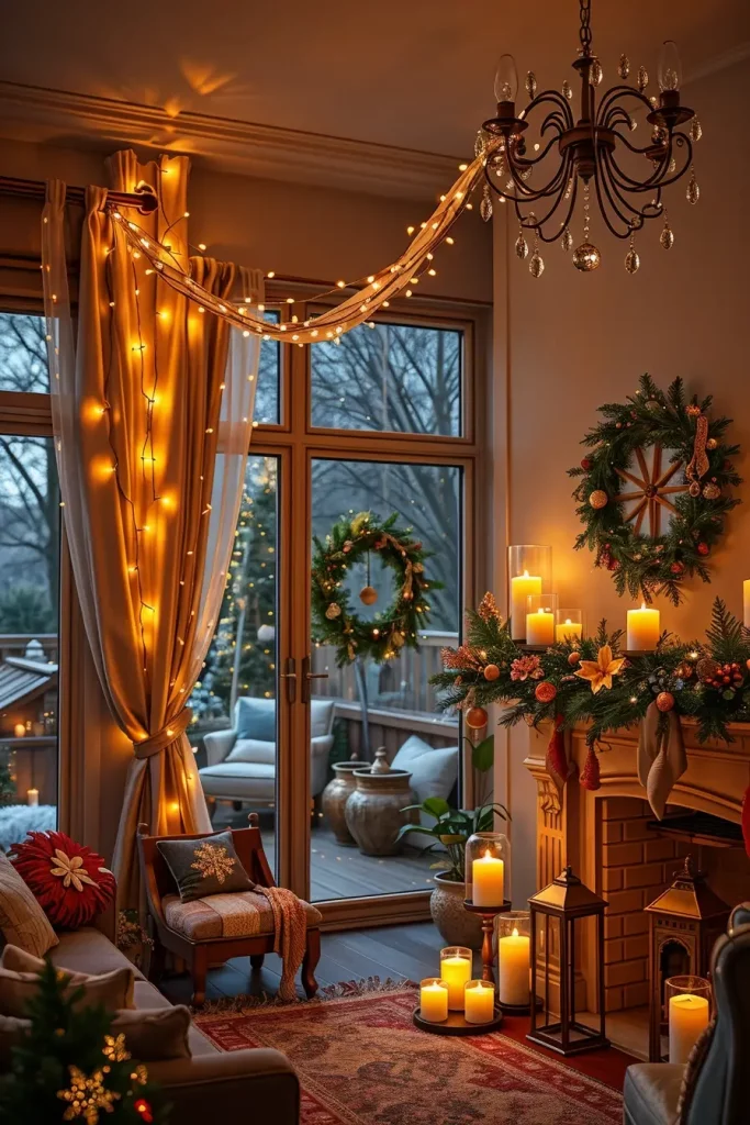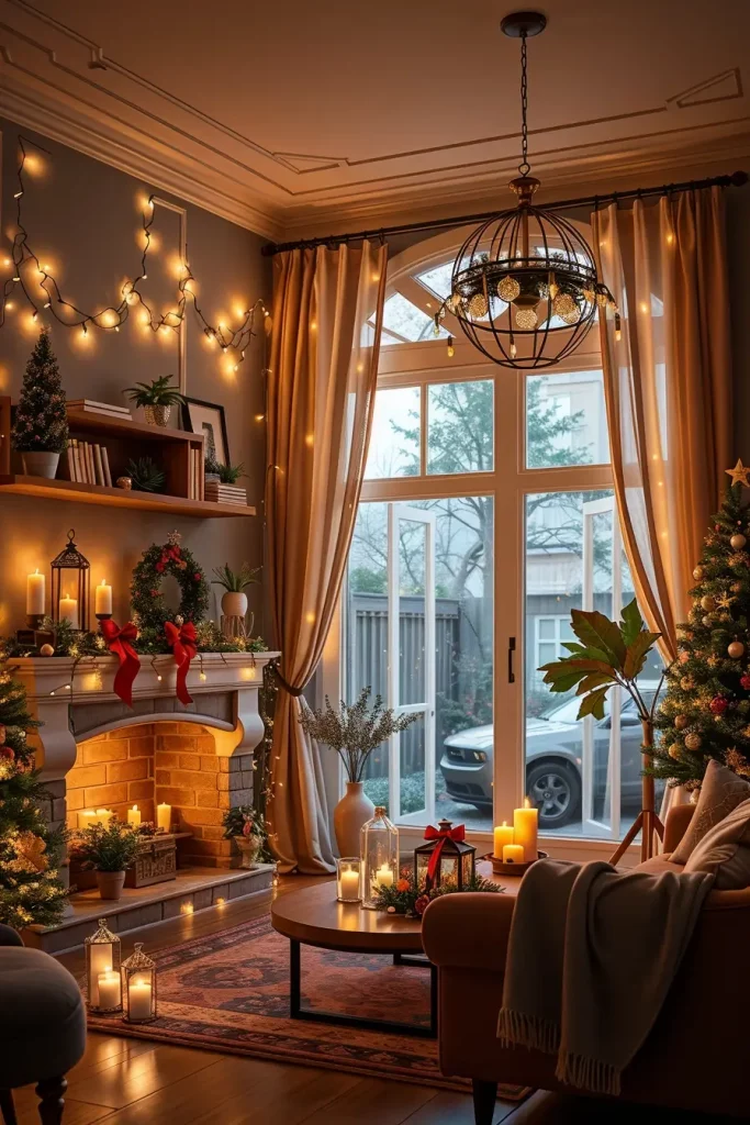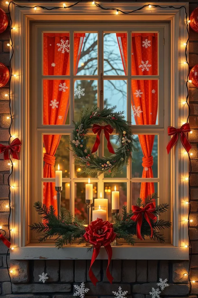 I suggest that candles should be battery-operated and placed on the sills of windows so that they provide a gentle light effect. Another method is to use hanging wreaths or delicate decorations in front of the windows that will not block the light of nature and make them festive. There are greenery or red ribbons attached to the curtain tiebacks, which is a little additional but beautiful detail.