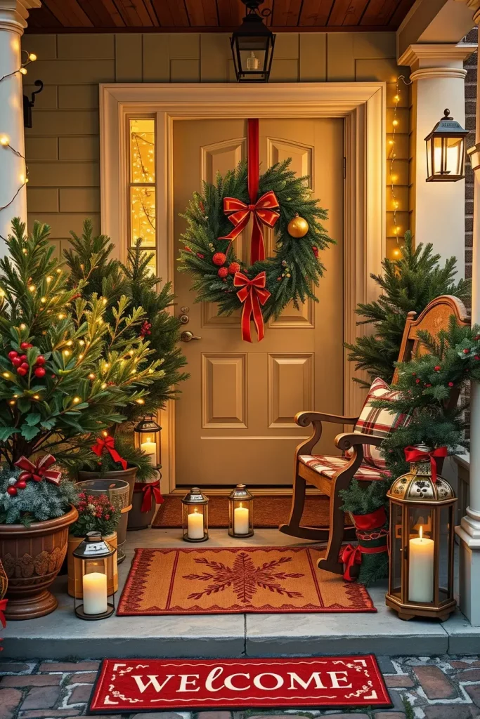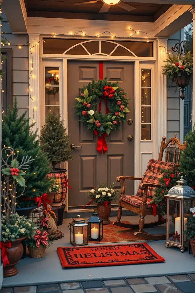 To make the porch very friendly I would recommend overlaying a festive doormat with a holiday themed runner. Plant evergreens along the entrance door that have fairy lights and ornaments. The entrance can be framed with hanging lanterns or huge wreaths. The porch can be made welcoming by adding rocking chairs or bench that has plaid cushions and is at the same time practical.