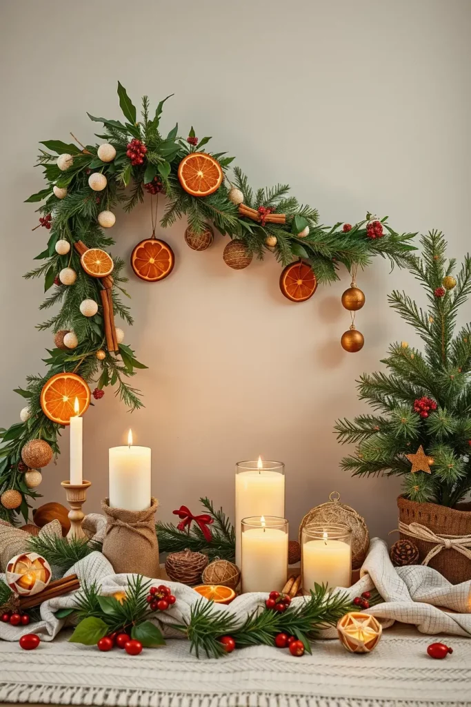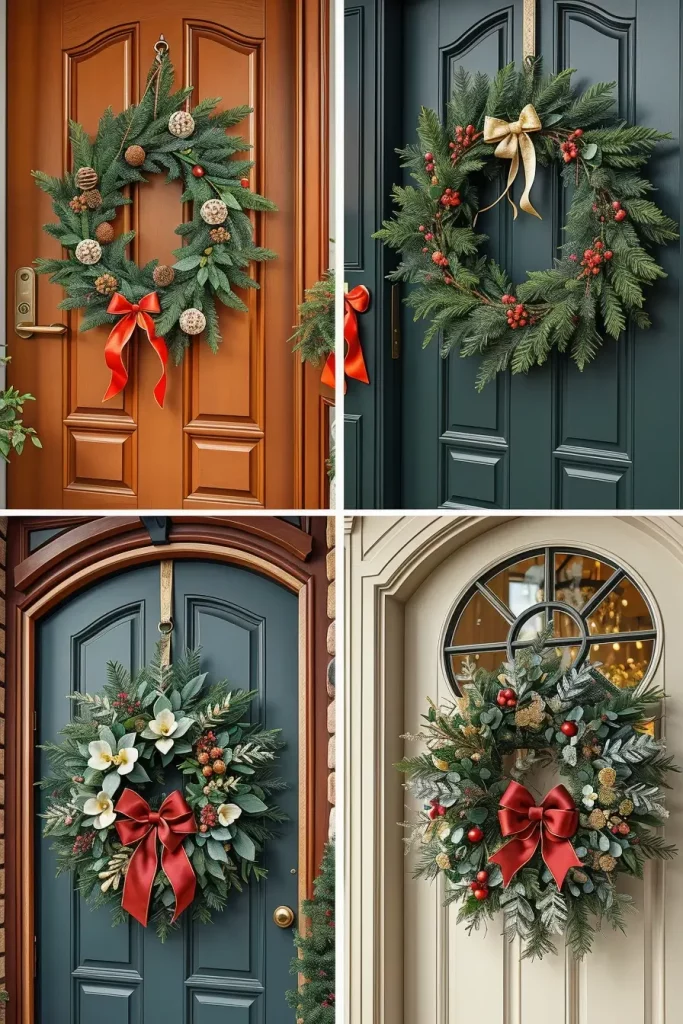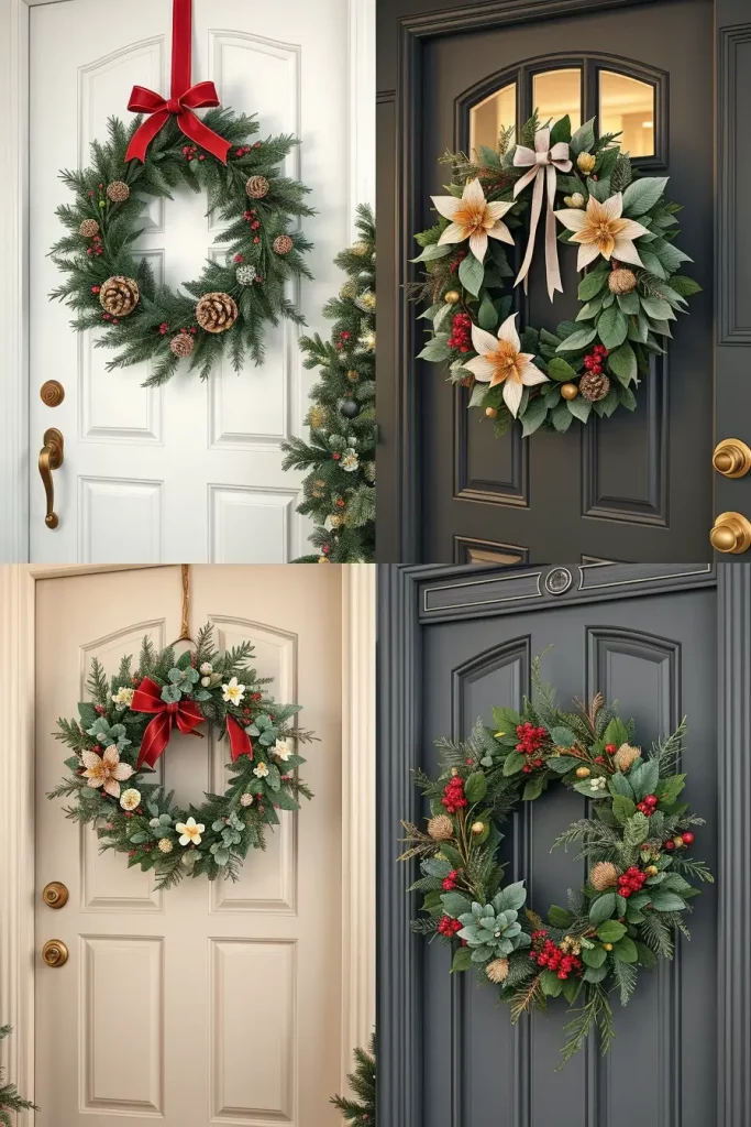 I would suggest the combination of natural elements with decorative ones like berries, pinecones, and metallic bows. Small wreaths of eucalyptus and touches of gold will be fine to give it a more modern appearance. The LED-lit wreaths are also a very interesting idea as they can be lit up overnight without any trouble.