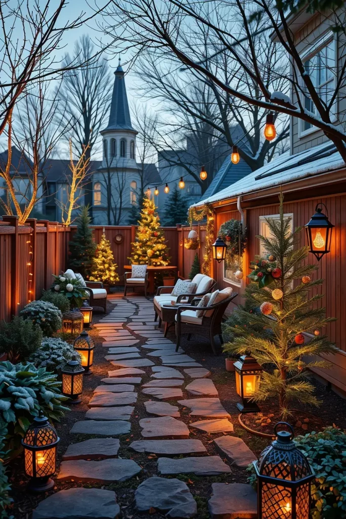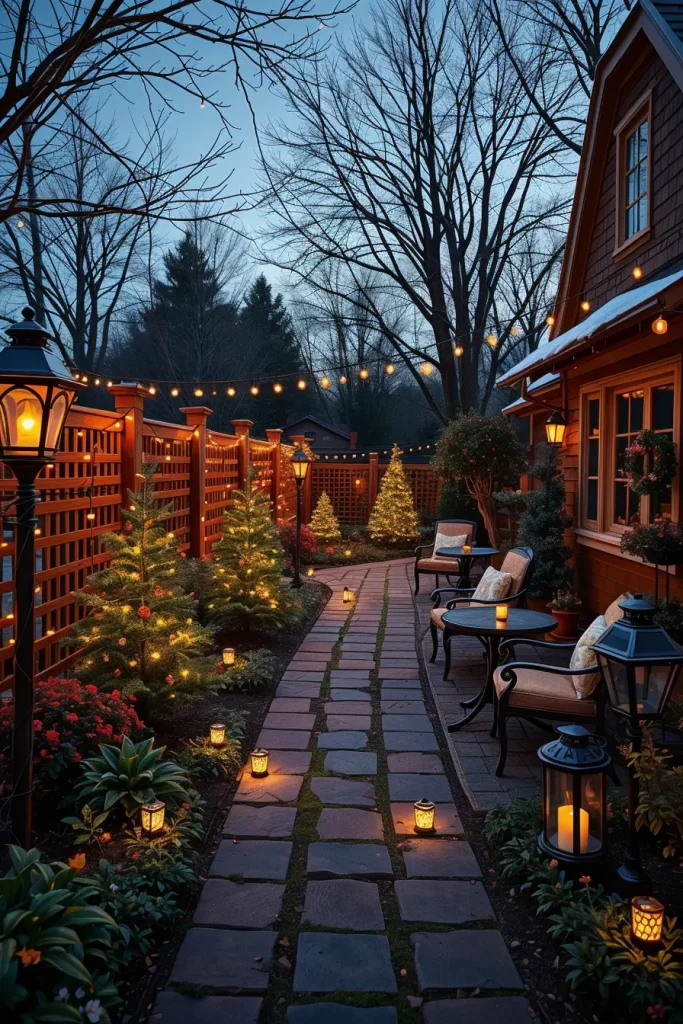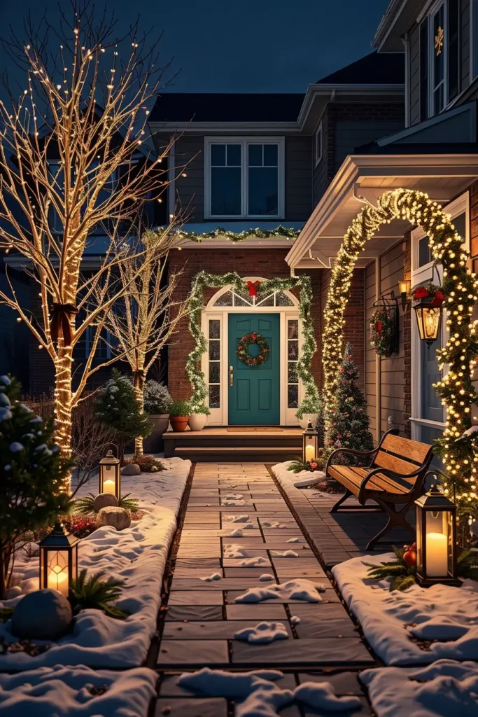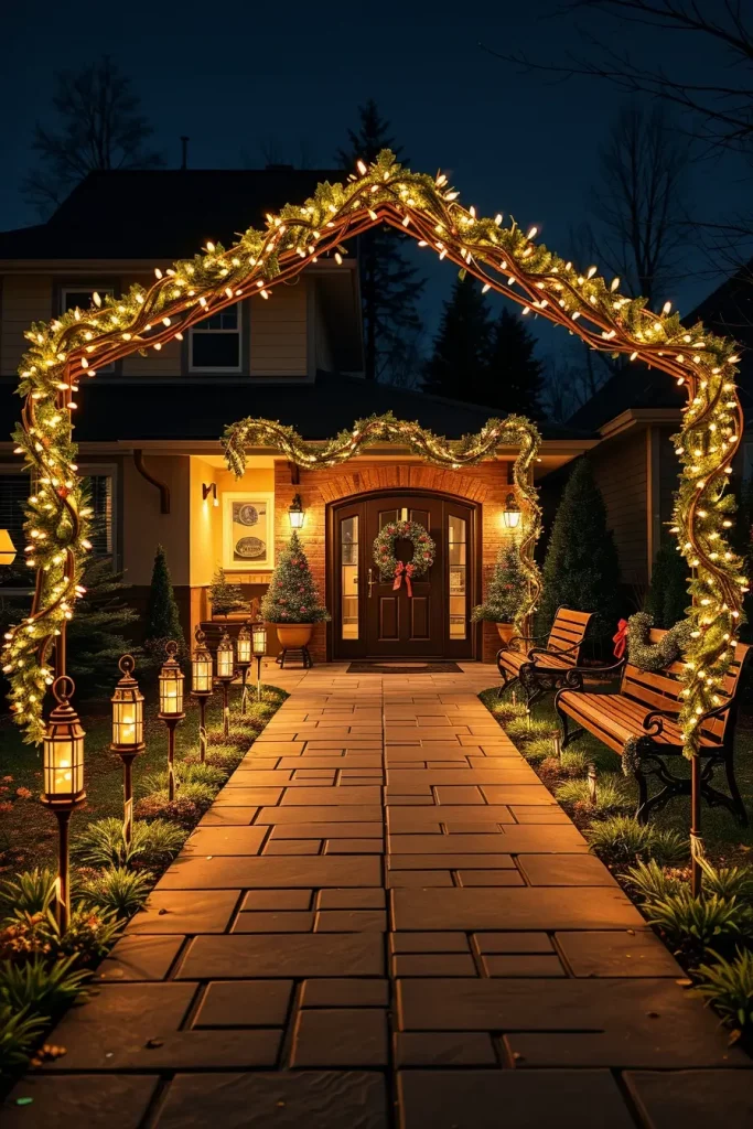 I have tried to add furniture or decor along the entrance such as small benches with garlands to add to the warm feeling. I also enjoy the use of weatherproof LED lanterns that can be combined with string lights on the pathways to create a balanced light. The use of LED lighting is energy efficient and will also be durable throughout the season.