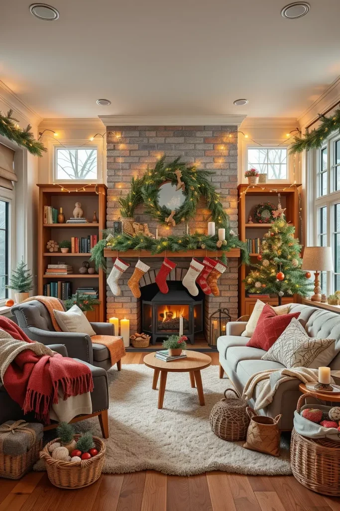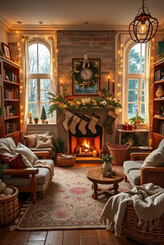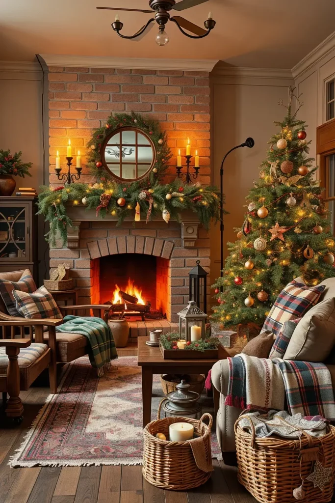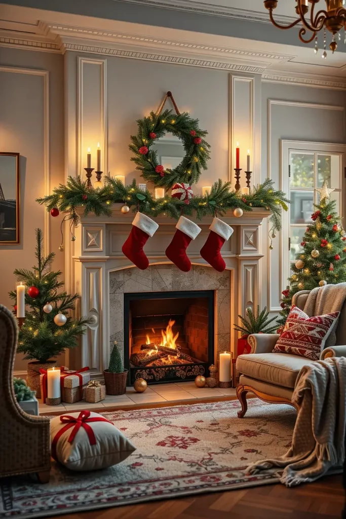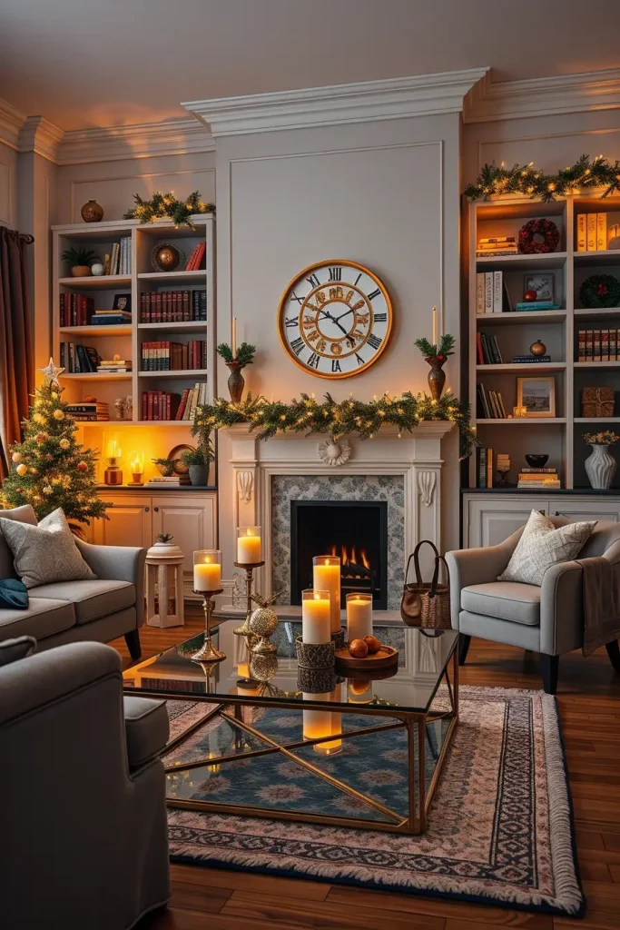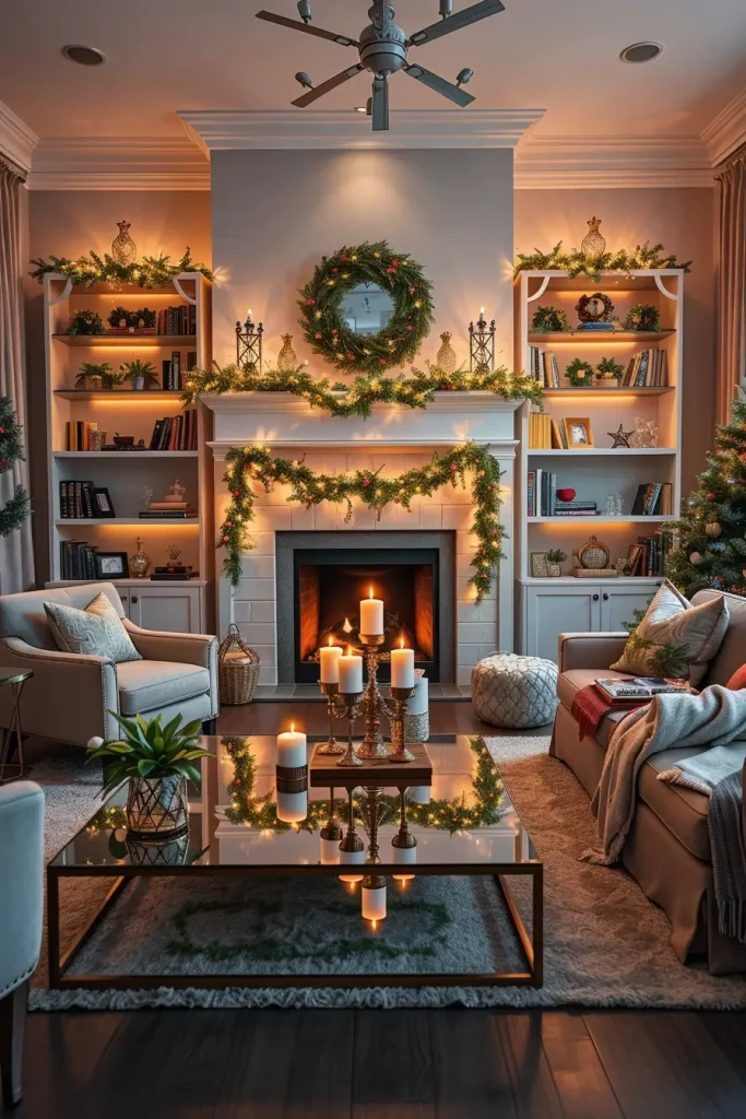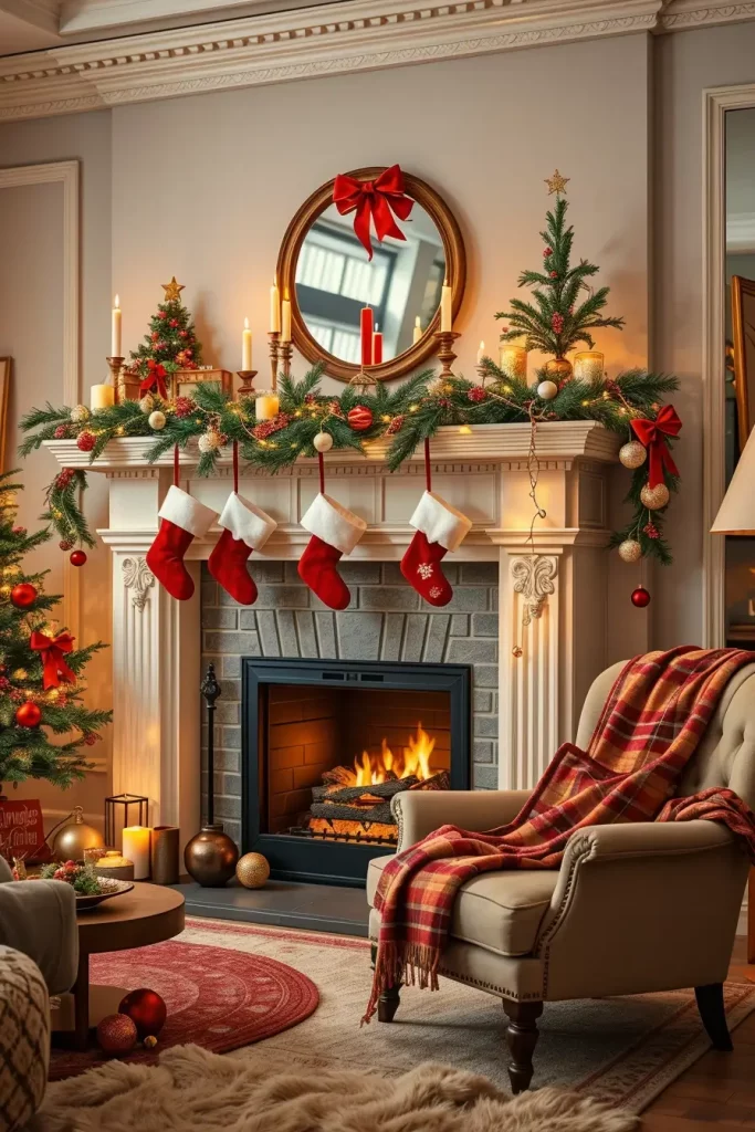 My designs prefer balancing mantel decorations with the furniture around it. The fireplace is framed with a large armchair close to the fireplace, soft holiday-themed throws, and a coffee table with a centerpiece to make the fireplace the central point of the room. This makes the lights bright in accordance with the general design.