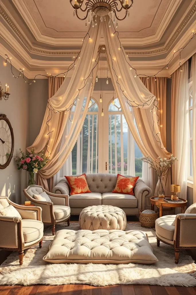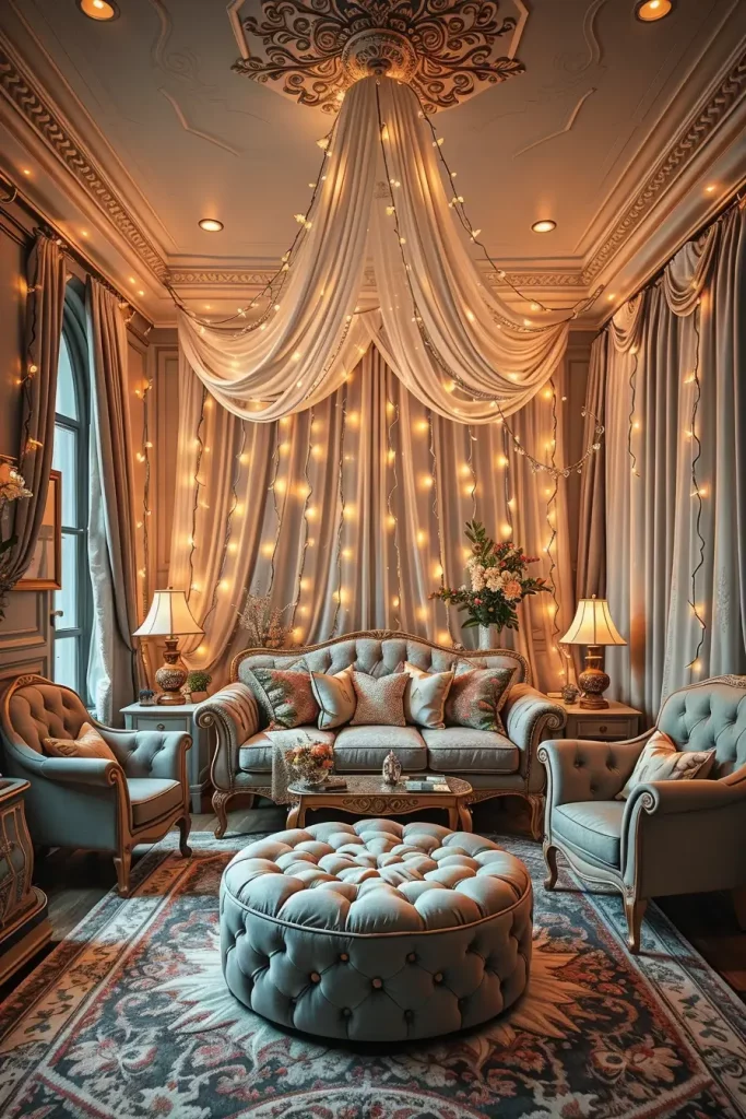 I prefer to have fairy lights in mirrors, in glass jars, or on bed headboards. The presence of them with sheer curtains or a canopy over the sofa softens the atmosphere and makes it whimsical. The look is finished with comfortable furniture, such as plush armchairs or tufted ottomans.