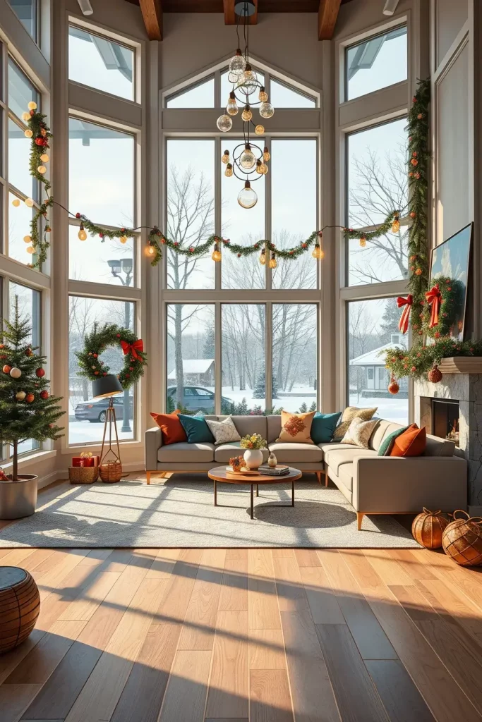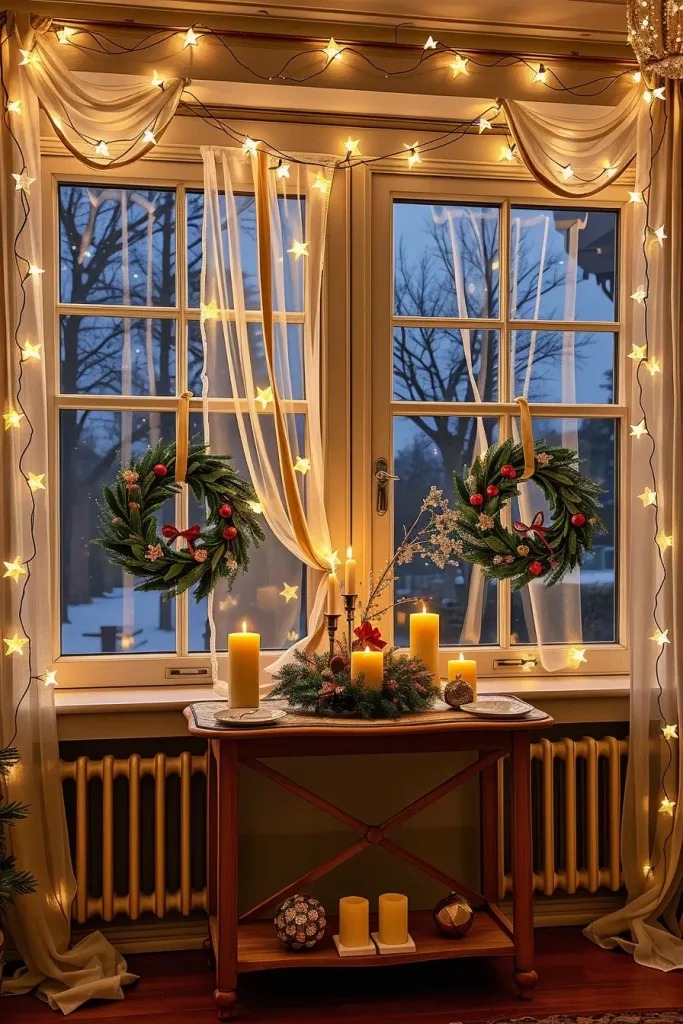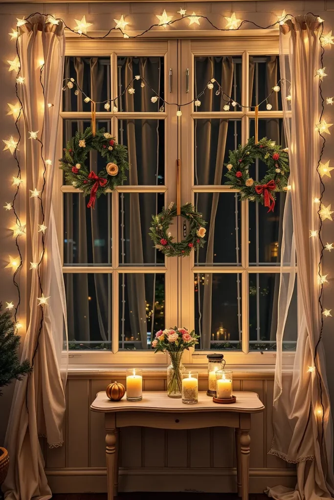 I tend to keep the furniture around windows simple such as accent chairs or small console tables so the lights can be the focus. The glow is added by adding wreaths or garlands to the window frames, and makes the window more symmetrical.