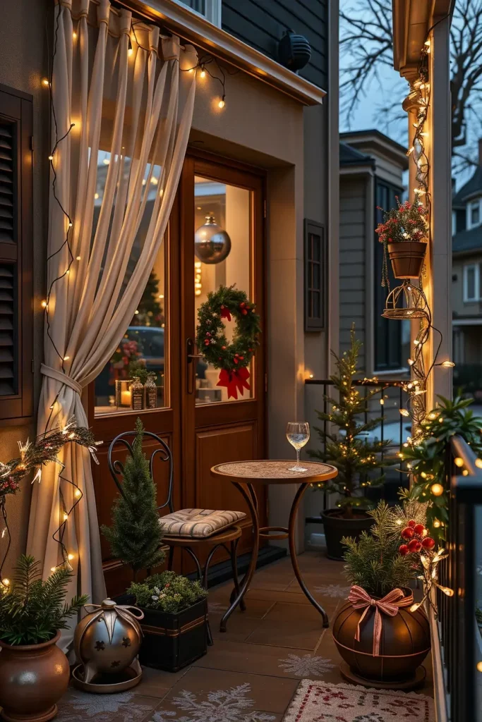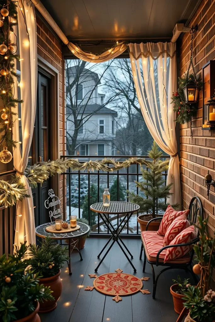 My usual combination of balcony lights is small bistro sets, potted evergreens, and outdoor cushions. In small apartments, the lights facing the window produce the effect of a bigger screen, which makes the place look celebratory both externally and internally.