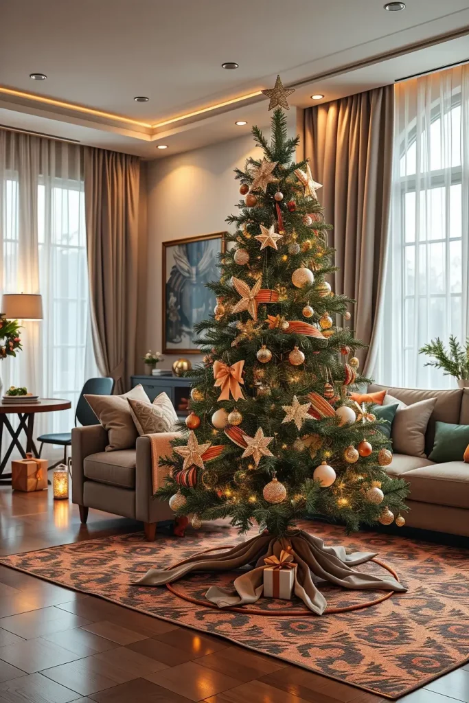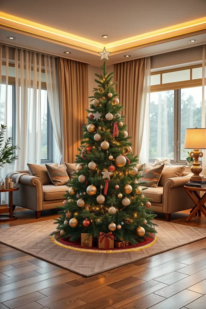I suggest that lights be wrapped tightly around branches, and weave deep inside of them to make them deep. The contrast is achieved by a combination of bulb sizes, and a tree skirt with a slight LED trim expands the light downwards. The focus on the tree is maintained with the help of complementary living room pieces, including a plush sofa and neutral drapes.
