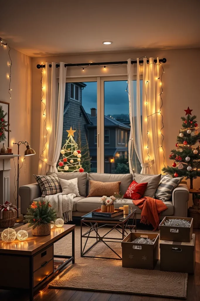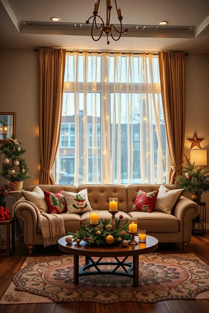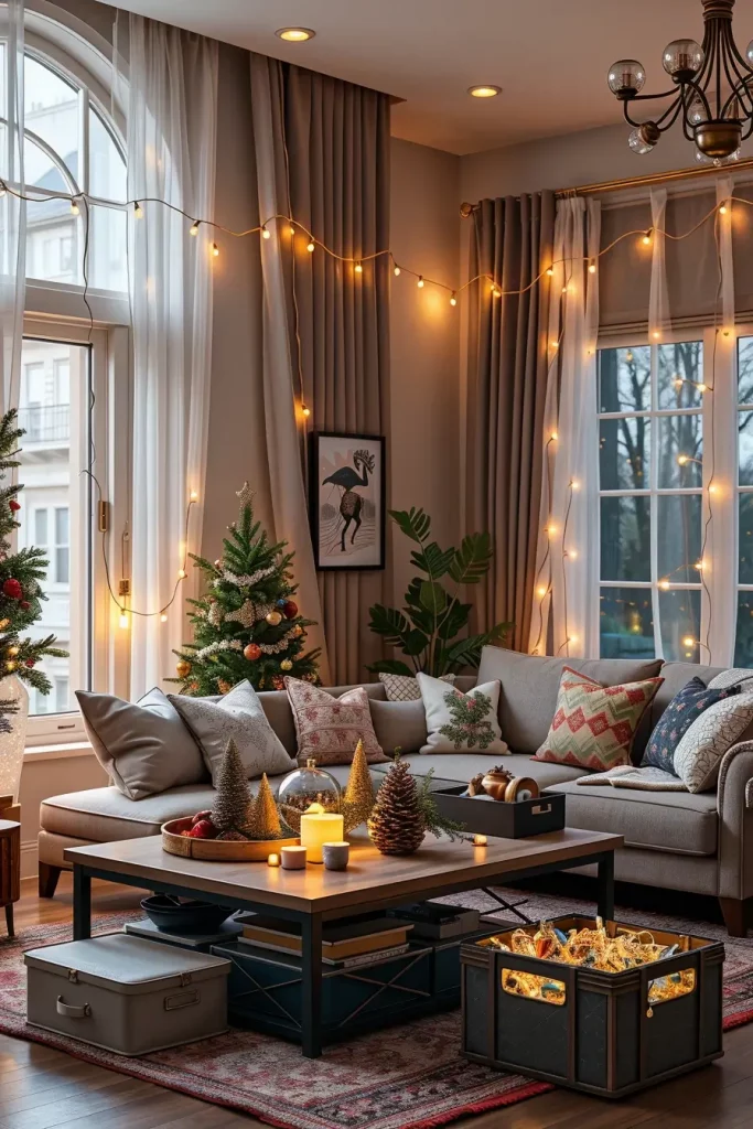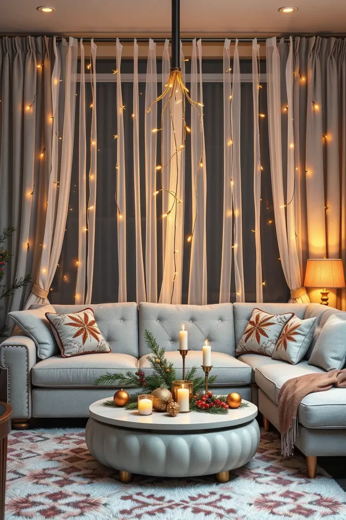Regarding furniture and accessories, I prefer to have curtain lights behind sheer curtain in the house. This dilutes the light and makes the living quarters comfortable enough to hold a party. Plush seating, festive pillows and a centerpiece of a coffee table will make the space inviting and present the lights as the central focus.
