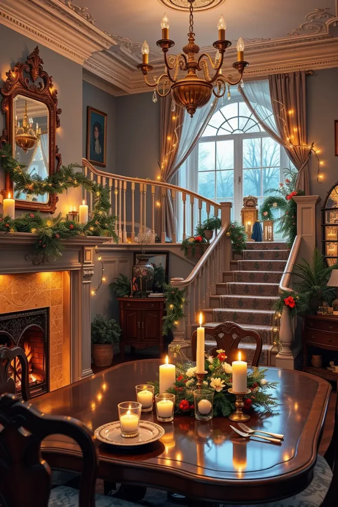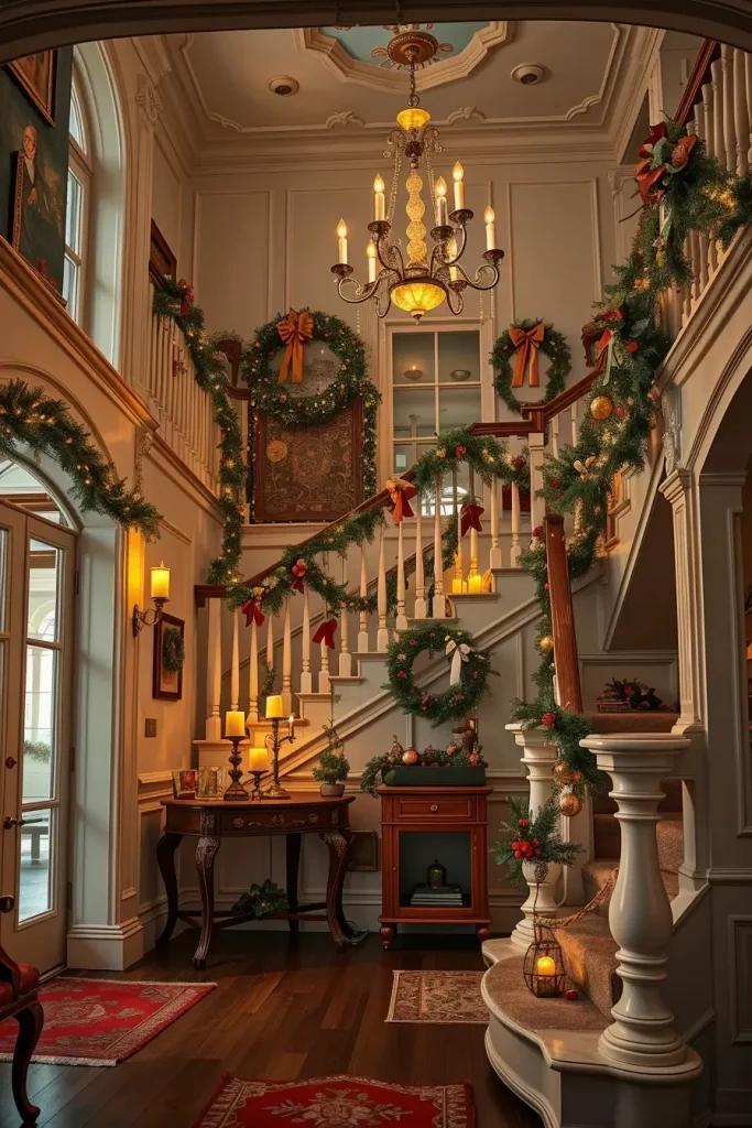 Overhead lighting is one of the things that I tend to lack. A chandelier or pendant lamp with small festive details such as ribbons or hanging decorations would connect the lights on the staircase with the rest of the larger decoration perfectly.