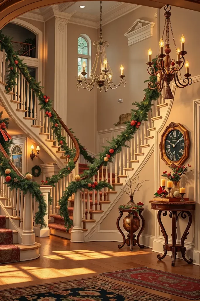 The location of furniture around the staircase is also important. I tend to have a side console table at the foot of the stairs, adorned with candles, a small nativity, or a bowl of decorations. This gives it a stratified look with the banister lights being incorporated into the general decor.