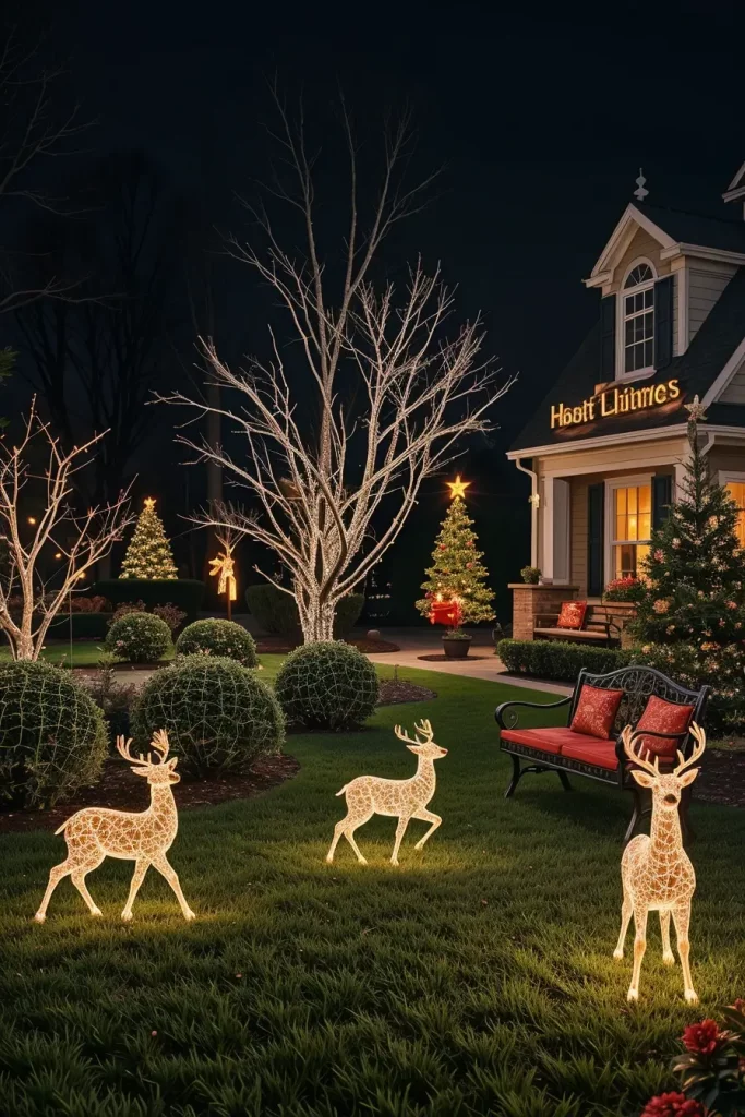 I would use net lights with ground decorations such as lit-up deer or holiday pathway posts. The nets are evenly lit and the decorative figures are more detailed to bring balance in the yard. Outdoors, furniture is not a very big factor, although benches or garden chairs with corresponding cushions can be used to make the space more welcoming in case guests are sitting outdoors.