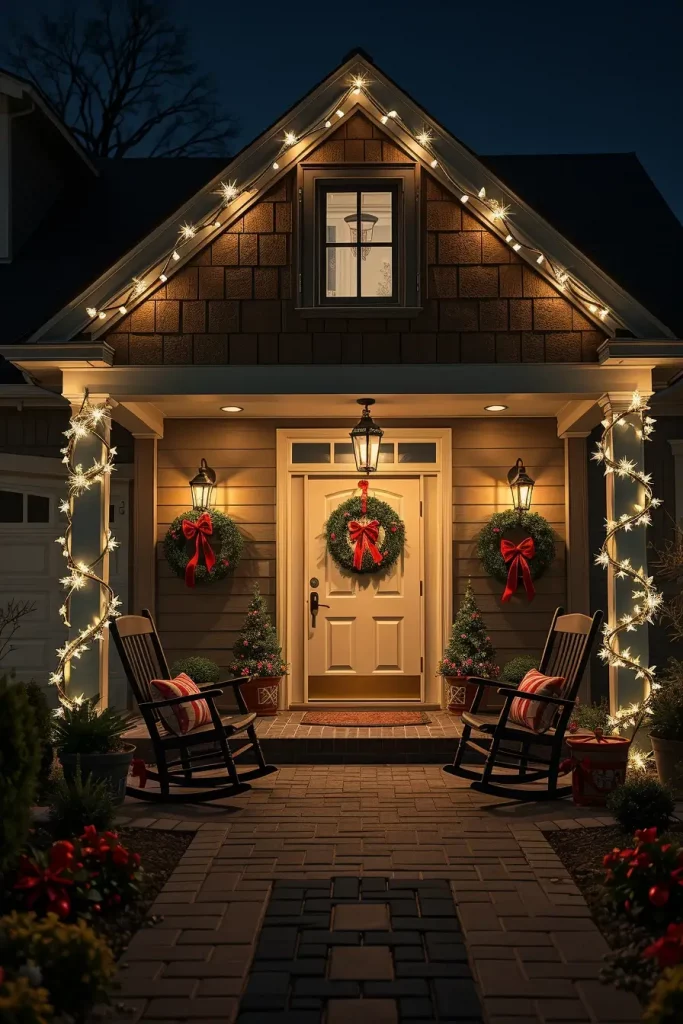 I tend to combine roofline lights with similar driveway borders, lit-up wreaths on the doors and outdoor furniture such as a bench or rocking chairs on the porch. The two of them make a united outdoor display.