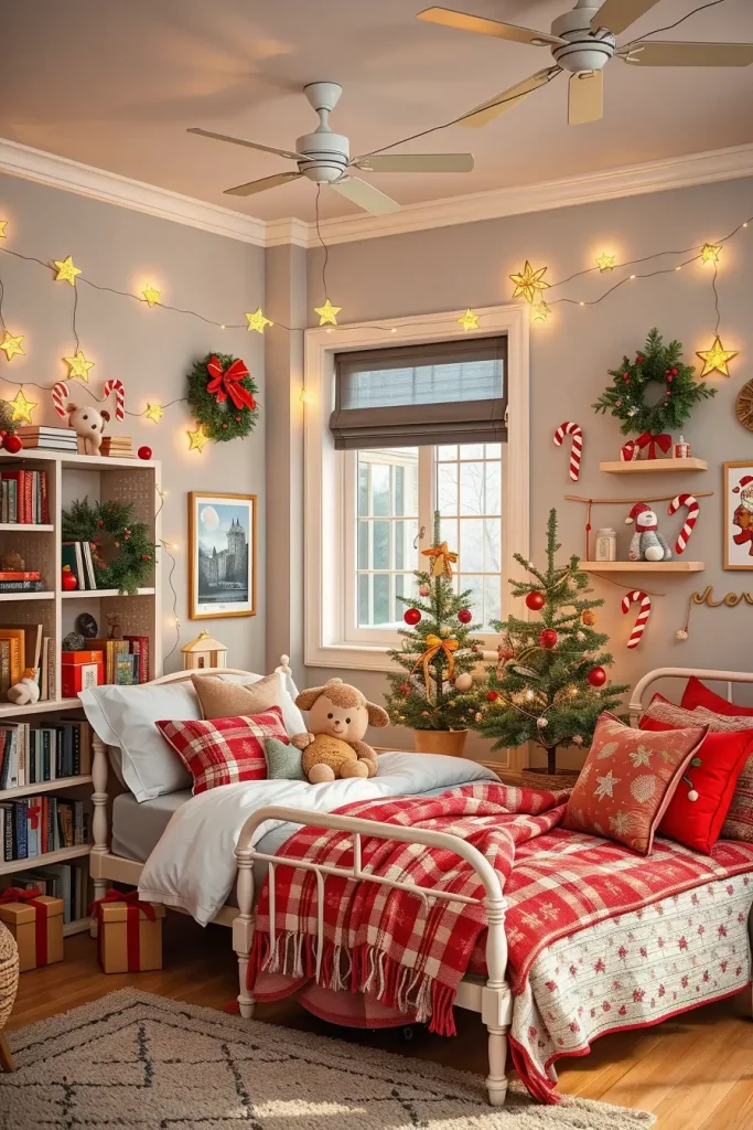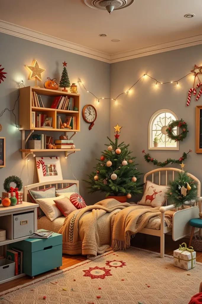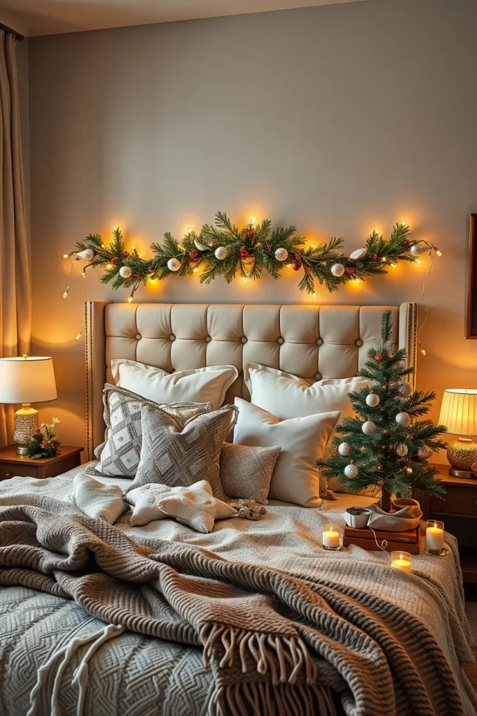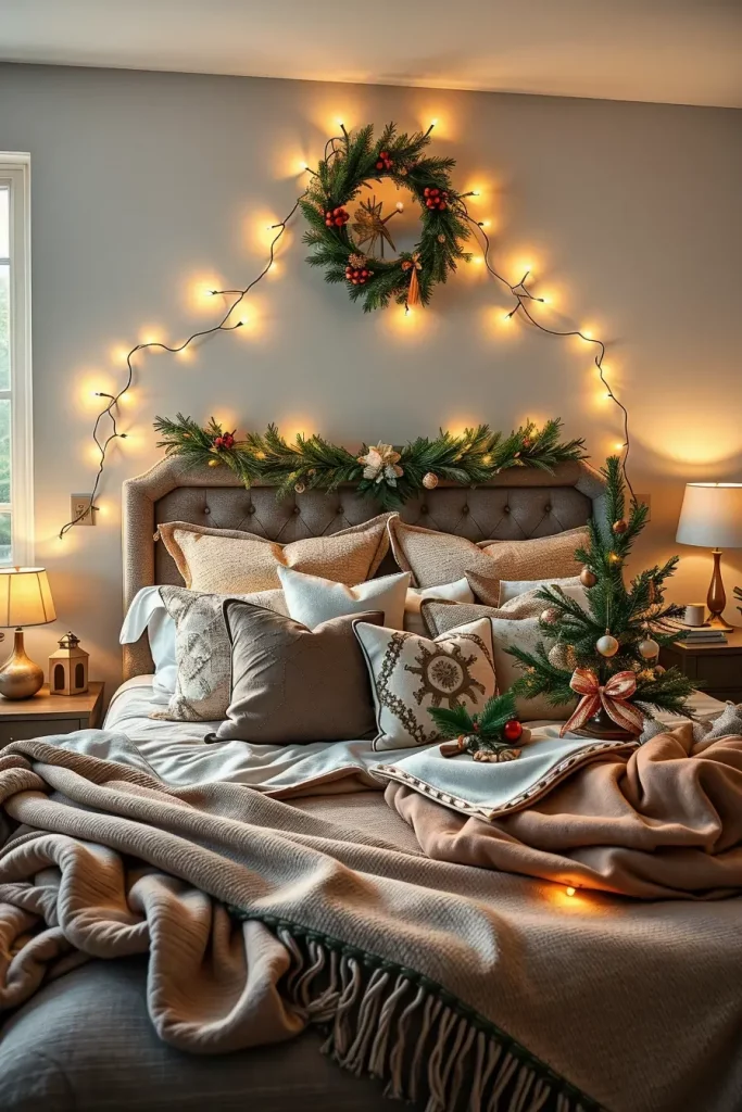 To make it even more effective, I would like to add a festive touch such as garland or a small tabletop tree next to the bed, accompanied with some fairy lights placed in a very specific manner. This finishes the design and connects the theme of the season.