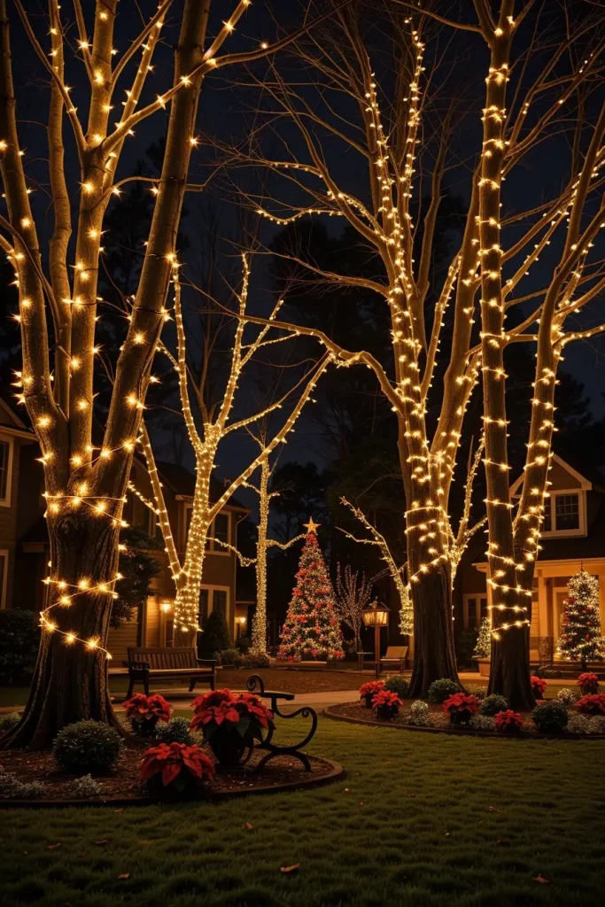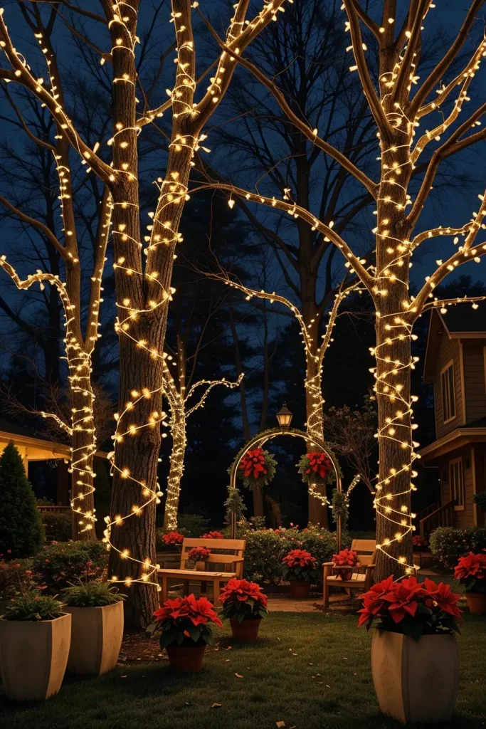 I usually supplement wrapped trees with garden furniture such as benches or small seating spots, and this way, the lighted trees can be viewed closely. It can be further improved by adding planters with poinsettias or lit-up ornaments at the bottom.