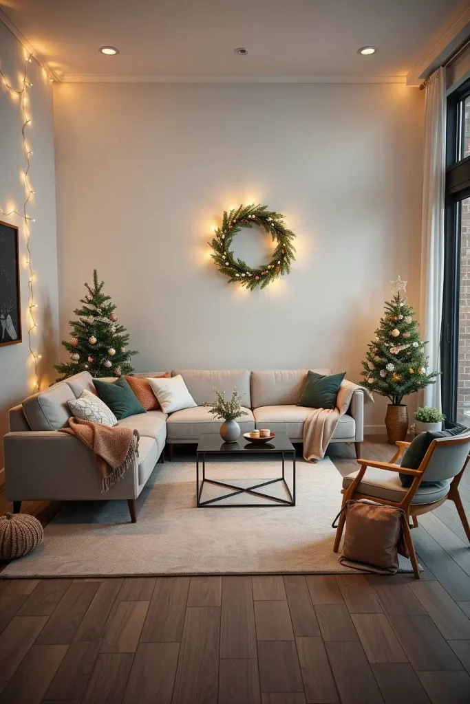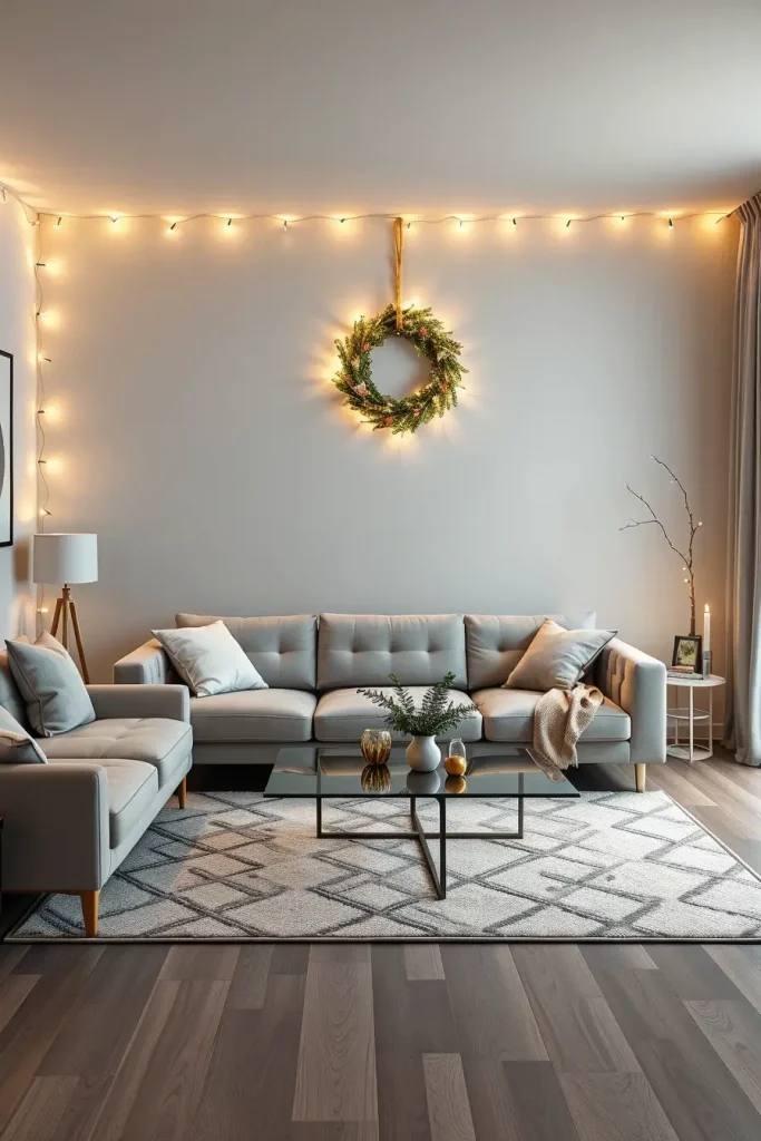 I prefer to combine the use of minimalistic lighting and smooth furniture. A simple sofa, a glass coffee table, and neutral-colored carpets contribute to the simplicity of the space, and the lights are able to add the right amount of festive flair to it. Outside, one line of lights on the roof or on a door can be sufficient to create an impression.