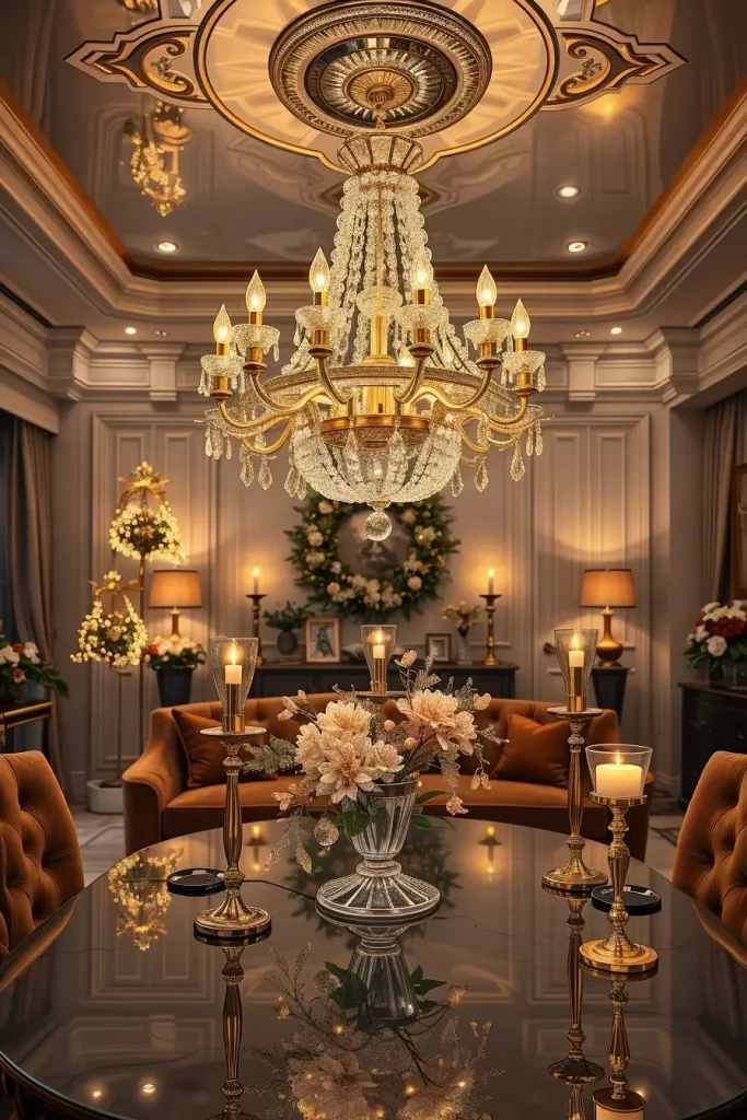 In this kind of installation, I usually suggest crystal-like glass droplets coupled with warm LED bulbs, as they are effective in dispersing the light throughout the room. The grandiose is added by adding nearby furniture like a smooth dining table with smooth chairs or a velvet sofa. I also prefer to use metallic candleholders as accessories, which reflect the shine of the chandelier. This strategy renders the space unified and joyful without being excessive.