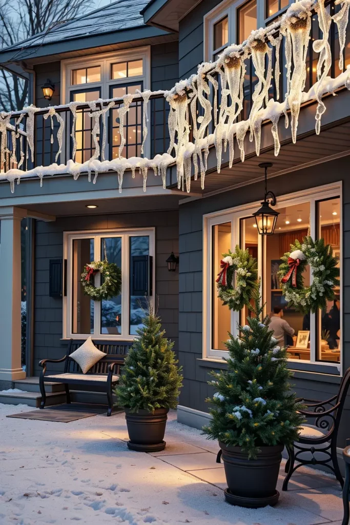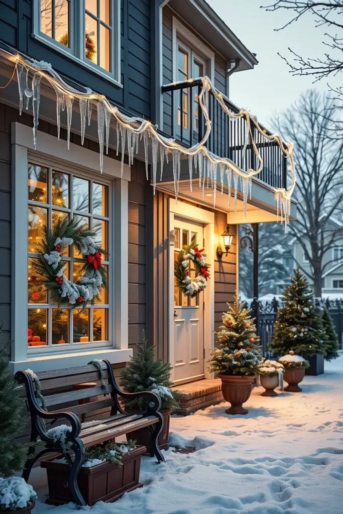 I tend to suggest cool white color of icicle lights because they resemble natural snow and ice. The display is harmonious with a plain outdoor bench, planters with evergreen and frosted wreaths. These lights also appear beautiful when reflected in snowy sceneries.