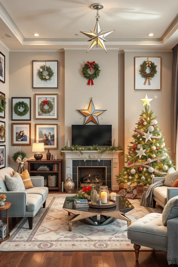 During the holidays walls should not be left bare. I tend to replace my everyday art with holiday frames or quotes. Even basic details such as metallic stars, wreaths on inner walls or even a gallery wall of family Christmas photos give a light and personal atmosphere.