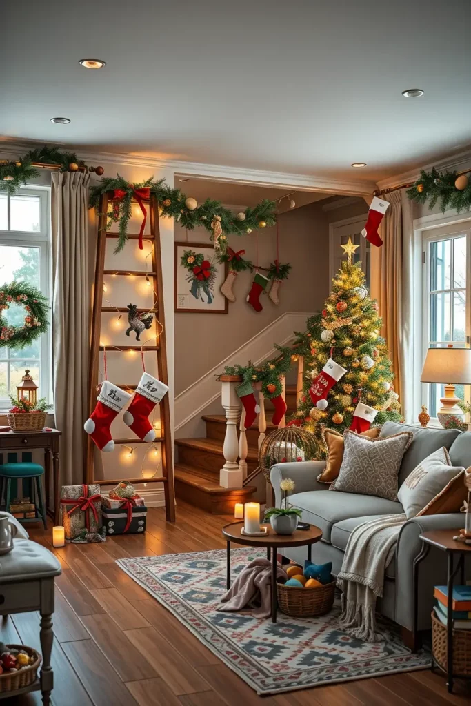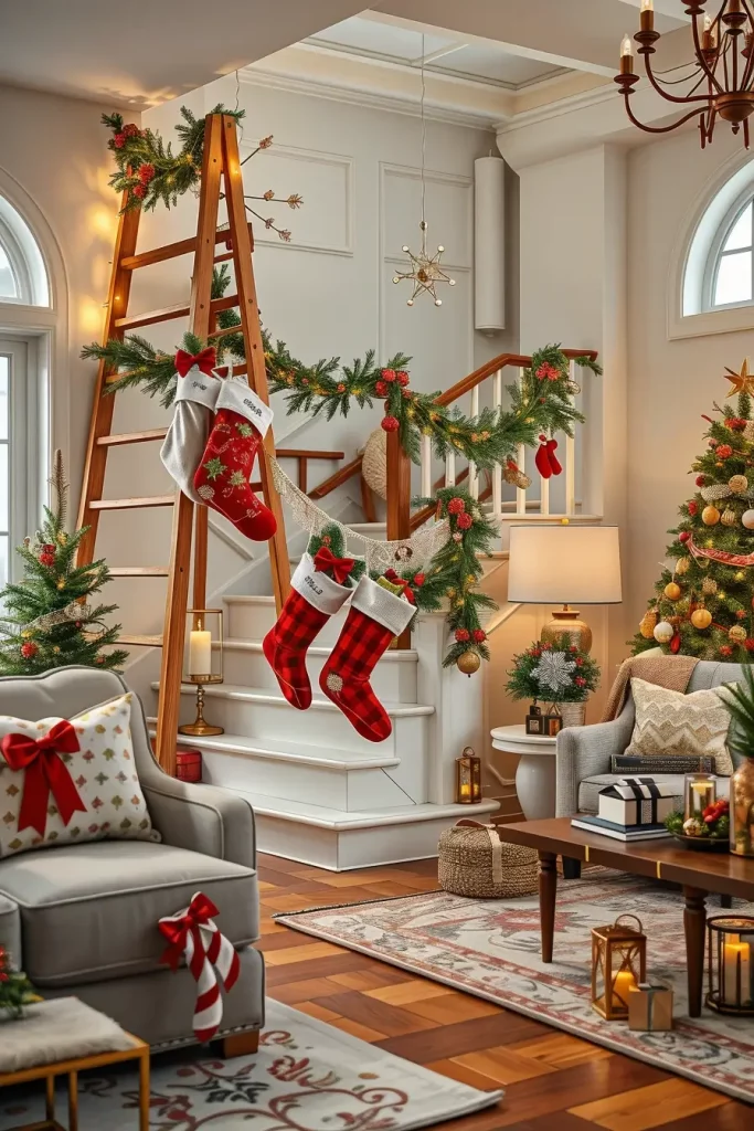 Stockings need not remain in the fire place mantel. I have been having fun in the past few years with creative displays of stockings and in 2025, it will be huge. Stockings may be hung along stair railings, or on ornamentsal ladders or even a gallery on a wall.