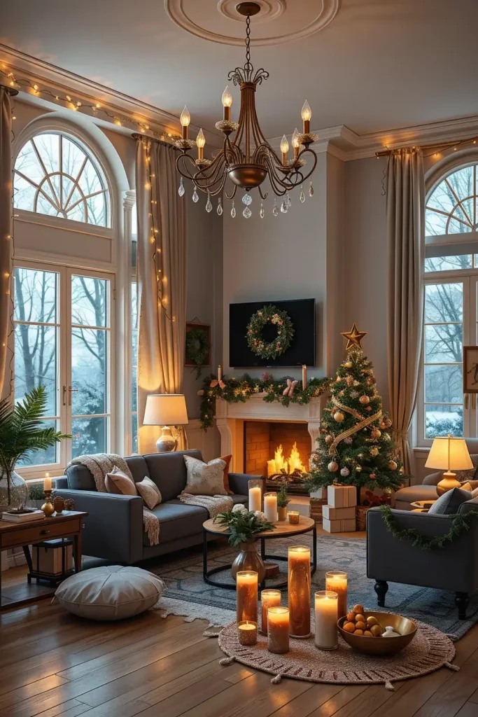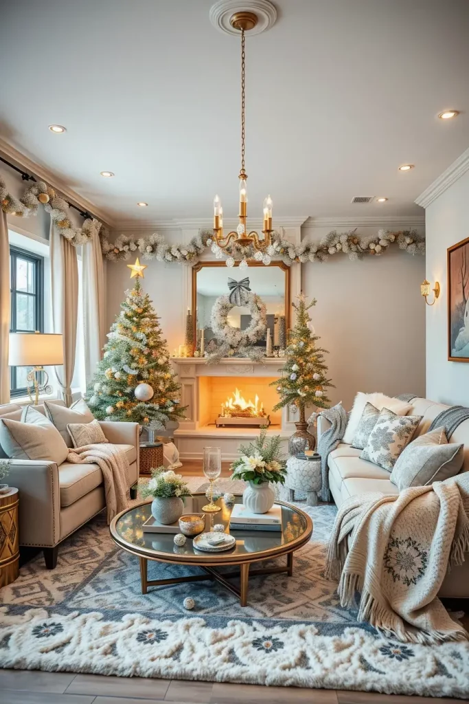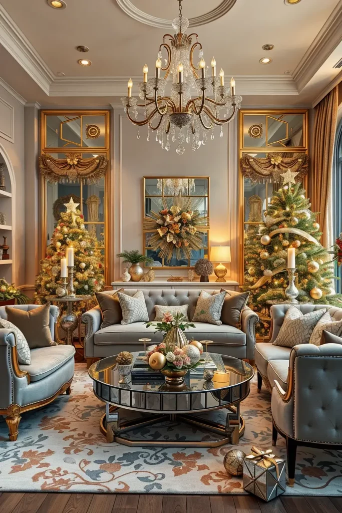 Practically, I would prescribe metallic decorations on the tree, mirrored coffee tables, and crystal chandeliers combined with metallic garlands. Metallic thread cushions, mirrors framed with gold, and silver candleholders are minor but highly effective details. I have discovered that, metallic vases with white flowers are also a good addition which can be used to tie the entire theme together.