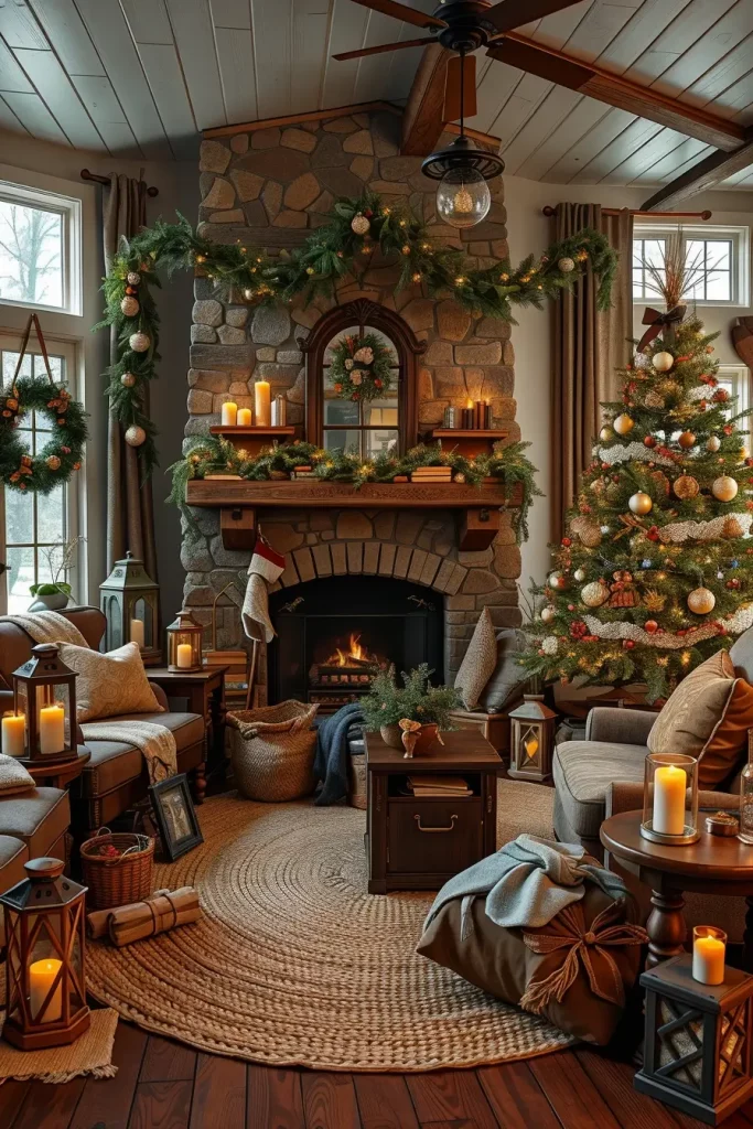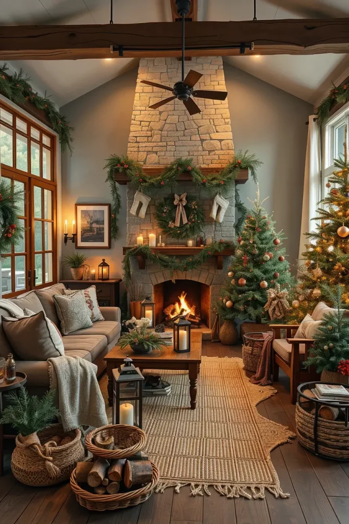A wooden, reclaimed coffee table, a jute rug, and plenty of pine branches or eucalyptus garlands would generally be featured in my personal arrangement. The appearance is completed with lanterns with candles and baskets of firewood. In the case of the tree, I like simple ornaments that are of wood, burlap or glass. The theme is anchored with the help of furniture that has worn finishes e.g. farmhouse-style dining table.