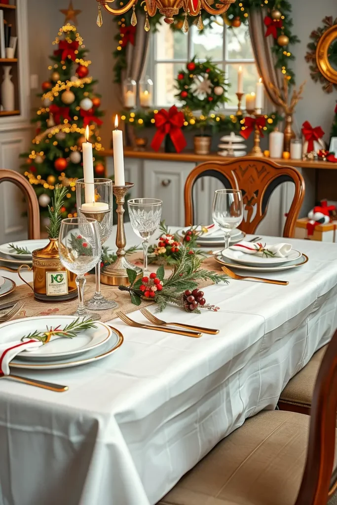 I prefer textiles like a linen tablecloth, a holiday runner, and velvet ribbon knotted napkins. Classical white dinner ware with gold flatware is appropriate and crystal glasses are used to provide a sparkle. It is nice touch, such as the personal name cards or sprigs of rosemary in napkin rings.