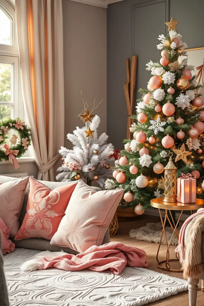 I tend to apply light pink ornaments, stockings, and details of ribbons. A pink-baubled and warm white lights flocked Christmas tree is beautiful. The decor is completed with furniture accents, e.g., blush velvet cushions, pink throws, or even a rose-gold side table.