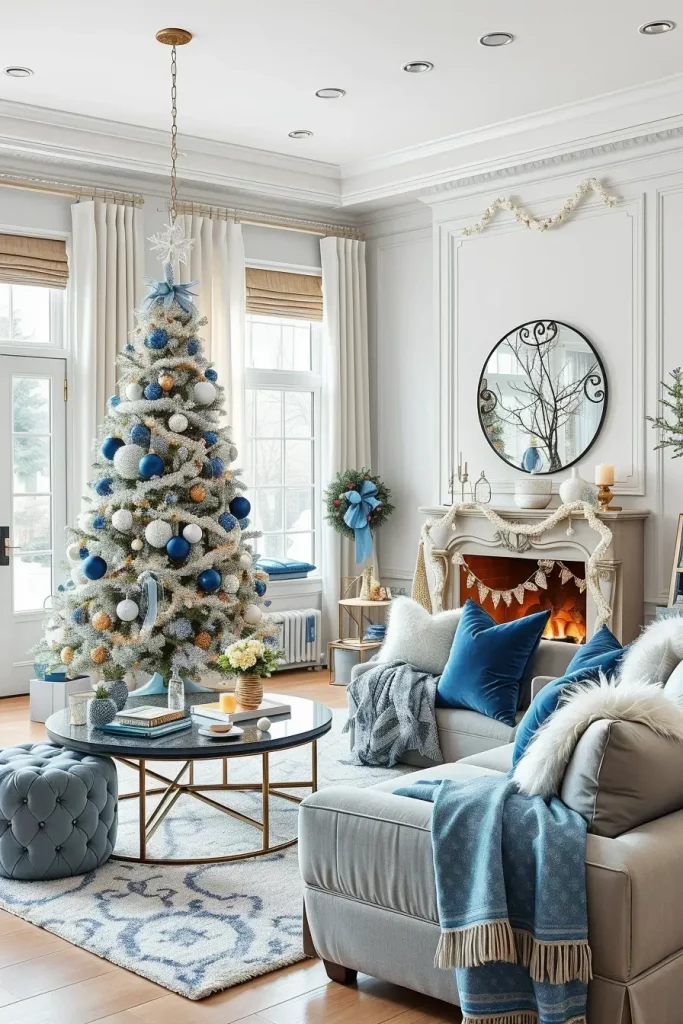 Typically I mix a frosted Christmas tree with navy decorations, white garlands and silver accents. The look is complemented with soft furnishing such as white faux fur throws, blue velvet cushions and linen curtains that are crisp. The neutral colors of furniture, including whitewashed wood, or light gray sofas, make sure that the palette is not too harsh.